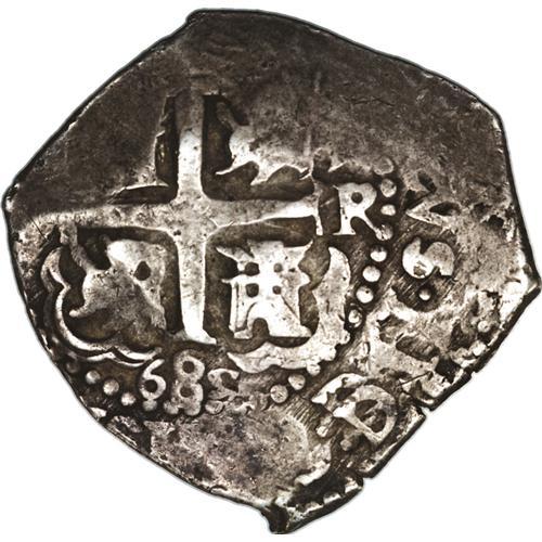 <B>Carlos II cob 8 Reales 1685-R, </B></I>KM24, choice lightly toned VF, two clear dates and three readable assayer R's. Additionally, due to an interesting double-strike at the base of the obverse, a third date is clearly visible.