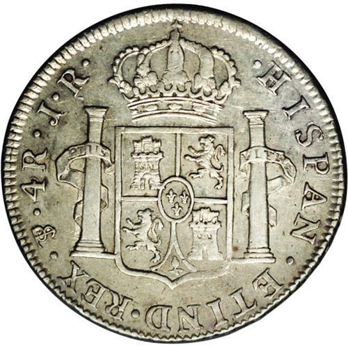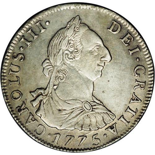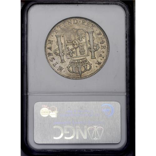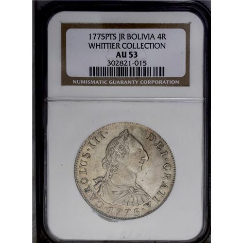 <B>Carlos III 4 Reales 1775-JR, </B></I>KM54, AU53 NGC, an attractive example of this scarce denomination with sharp design details and subtle toning.