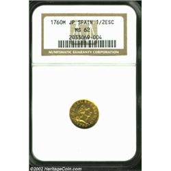Carlos III Gold 1/2 Escudo 1760M-JP, C41.1, KM389.1, MS62 NGC. Rich, reddish-golden frosty surfaces.