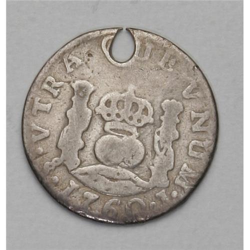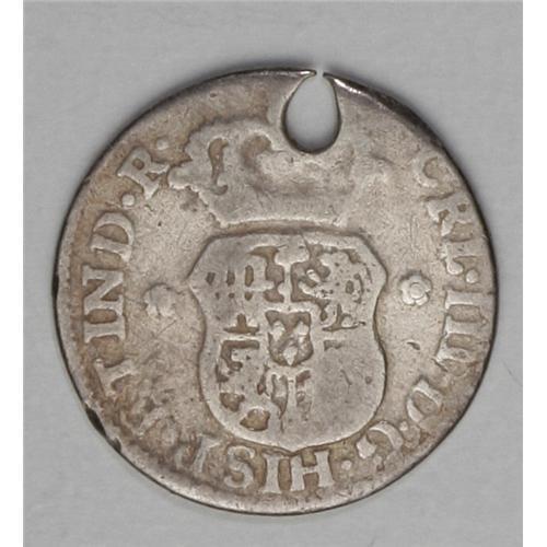 <B>Carlos III Pillar 1/2 Real 1760J-So, </B></I>KM15, VG with all details quite clear, holed at the top. This little type is extremely rare with perhaps 2-3 specimens known and represents one of the most elusive coins in the entire Spanish colonial series. Specialists in this coinage will recognize the importance of this offering.