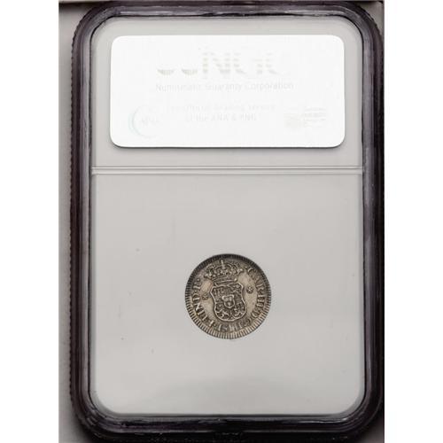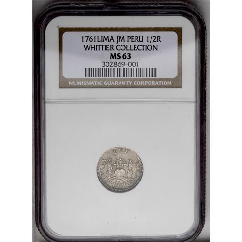 <B>Carlos III Pillar 1/2 Real 1761-JM, </B></I>KM60, MS63 NGC, a lovely little coin with choice and fully original toning. The 6 also appears to be cut over a 5.