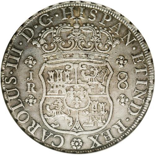 <B>Carlos III Pillar 8 Reales 1767-JR, </B></I>KM50, XF45 NGC, four petal variety, a well-detailed and nicely toned example of this rare first date of the Potosi colonial series.