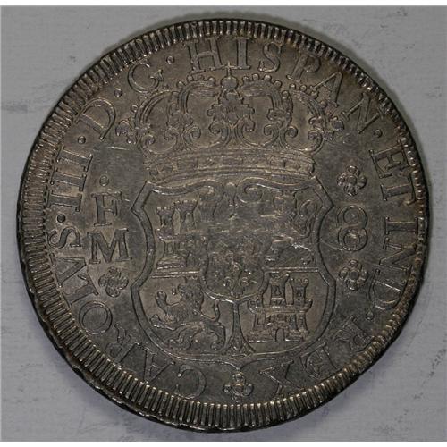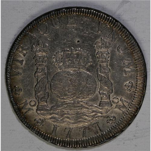 <B>Carlos III Pillar 8 Reales 1771-FM, </B></I>KM105, lustrous XF-AU, nicely toned legends, small dig in the obverse field above the crown.
