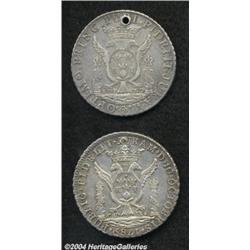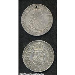 Carlos III Proclamation 1760, Fonrobert 8921, for the accession of Carlos III in Lima, 37 mm, VF holed and scarce, plus Proclamation 1789 Fonrobert 8942 for the accession of Carlos IV in Lima, 37 mm, toned XF, plugged hole.From the Morris Geiger Collection. 2 coins Important notice: Heritage usually auctions material at the rate of 200-250 lots per hour. On some occasions eBay Live bid software or the Internet may not be able to keep up with the pace of the auction. We recommend placing a realistic absentee bid now as insurance to avoid disappointment. Occasionally the auctioneer may eliminate or reject an eBay Live bid, and the auctioneer may also reopen a lot after the close of the eBay live bidding (usually because we missed an audience bid), and may reject your bid even if it shows you as the winning bidder. By bidding via eBay Live, you agree that Heritage may award the lot to another bidder at its sole discretion under the circumstances described above or any other reasonable circumstances. Also please note that all Heritage lots purchased through eBay Live carry a 20% Buyer's Premium. Please make sure you read the Terms and Conditions before you bid.