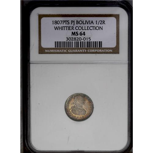 <B>Carlos IIII 1/2 Real 1807-PJ, </B></I>KM69, MS64 NGC, a choice example with pleasing deep harvest orange and russet toning blending with full mint luster. Rare quality and very attractive.