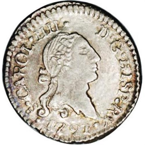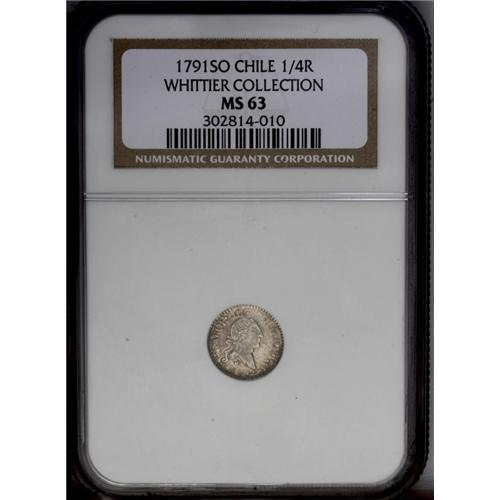 <B>Carlos IIII 1/4 Real 1791-So, </B></I>KM46, MS63 NGC, superb details with light and highly appealing toning, perhaps the finest known. Every detail on the King's bust is completely defined and there are no adjustment marks or other blemishes. Second issue with the King's title as CAROL IIII.