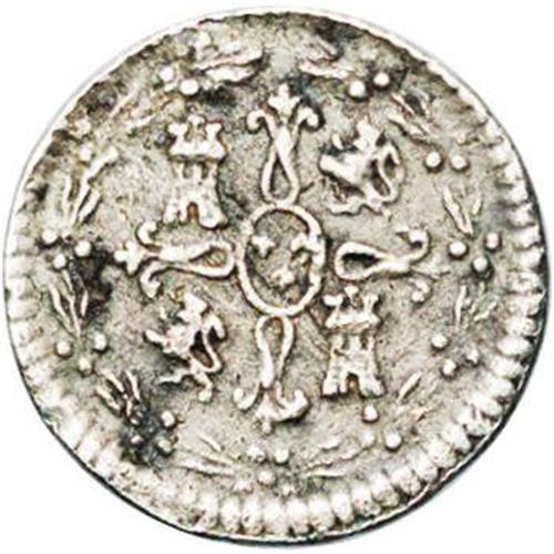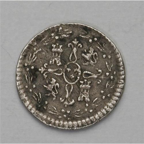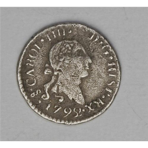 <B>Carlos IIII 1/4 Real 1792-So, </B></I>KM46, bust of Carlos III, interesting overdate which appears to be 2 over 5. VF details but the surfaces are uniformly pitted from oxidation.