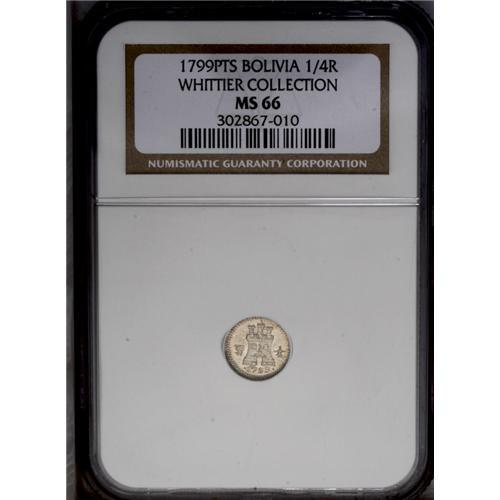 <B>Carlos IIII 1/4 Real 1799, </B></I>KM82, MS66 NGC, another gorgeous example with full blazing mint luster and light, original toning.