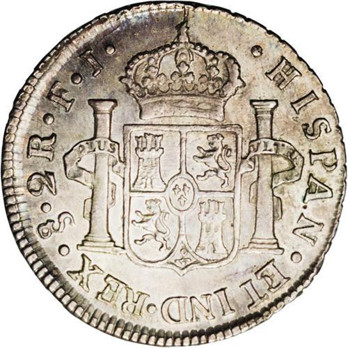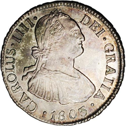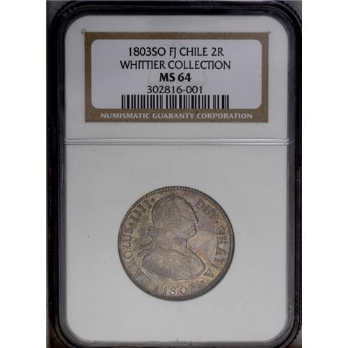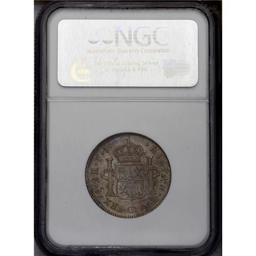 <B>Carlos IIII 2 Reales 1803FJ-So, </B></I>KM59, MS64 NGC, a superb coin with light gray patina and flashes of gold in the legends, very bold details and undeniable eye appeal. Certainly very few coins of this era have been certified this high.