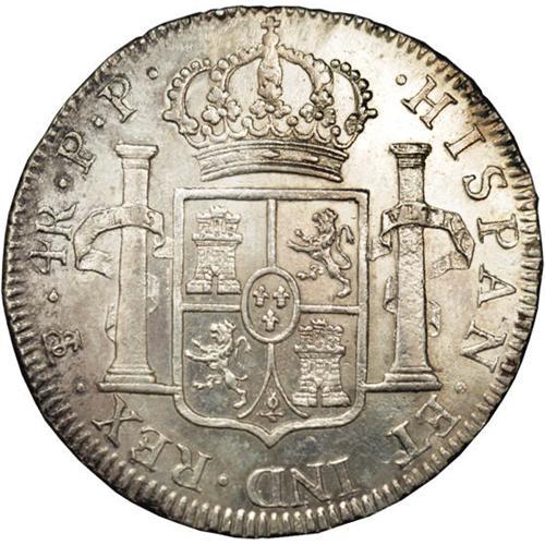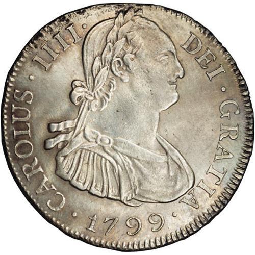 <B>Carlos IIII 4 Reales 1799-PP, </B></I>KM72, AU-UNC with very bold design details, harshly cleaned long ago to remove surface oxidation and now beginning to tone.