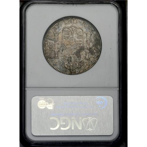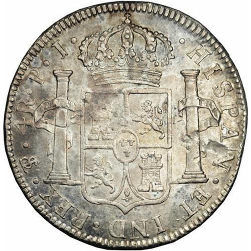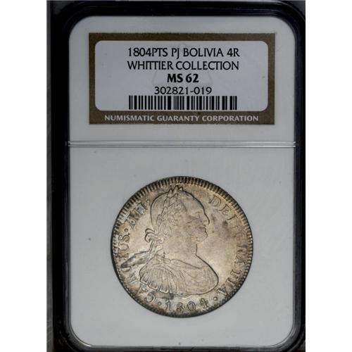 <B>Carlos IIII 4 Reales 1804-PJ, </B></I>KM72, MS62 NGC, some planchet laminations as produced but an attractive coin with strong details, abundant mint luster and appealing gray and gold patina.