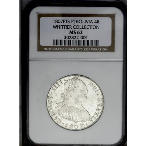 <B>Carlos IIII 4 Reales 1807-PJ, </B></I>KM72, MS62 NGC, fully lustrous and exceptionally well-struck, the obverse displays some light flan porosity (as made) while the reverse is virtually flawless with intense white mint luster. Very scarce and desirable grade for this denomination.