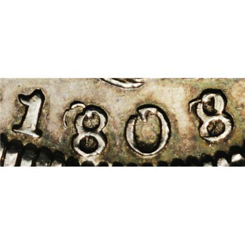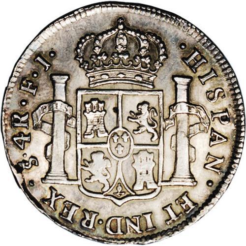 <B>Carlos IIII 4 Reales 1808/7FJ-So, </B></I>KM60, bold AU, lightly polished long ago and now attractively toned, extremely bold overdate. Rare grade for this denomination.