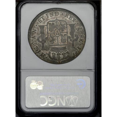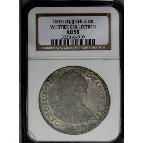 <B>Carlos IIII 8 Reales 1803/2-So FJ/JJ, </B></I>KM51, AU58 NGC, a choice, lightly toned example free of adjustment marks or flan flaws. The overdate and over-assayer are quite bold and the overall eye appeal of this coin cannot be overstated. Rare and desirable in this quality.