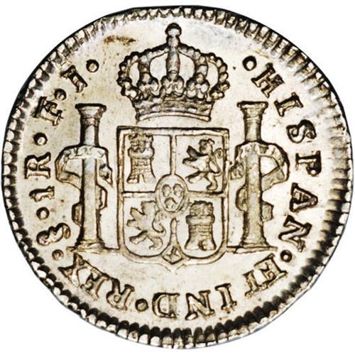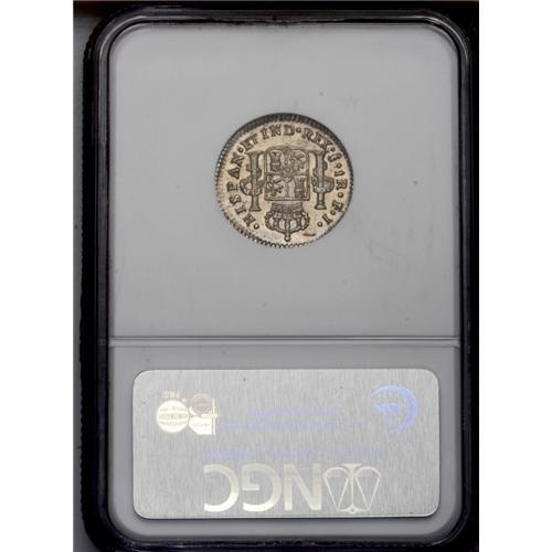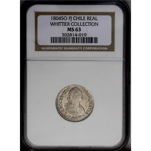 <B>Carlos IIII Real 1804FJ-So, </B></I>KM58, MS63 NGC, a superbly struck example with gleaming mint luster and attractive light toning. This is the scarce variety with the F of the FJ assayer's initials punched over a J from the previous administration.