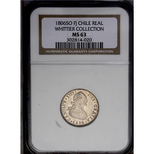<B>Carlos IIII Real 1806FJ-So, </B></I>KM58, MS63 NGC, fully lustrous with sharp details and no adjustment marks. Certainly among the finest extant for this scarcer date.