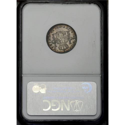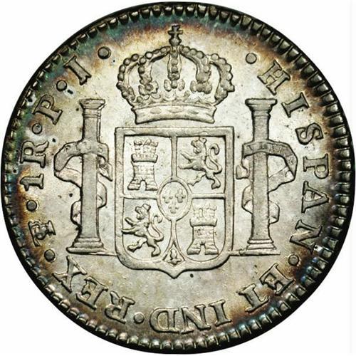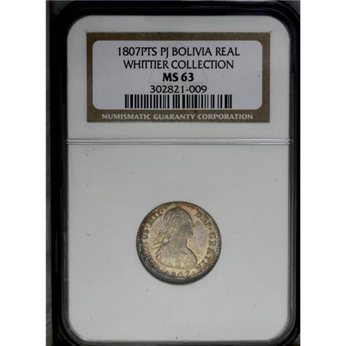 <B>Carlos IIII Real 1807-PJ, </B></I>KM70, MS63 NGC, a glorious coin with a rainbow of patina over fully lustrous fields. Rare and very desirable grade.