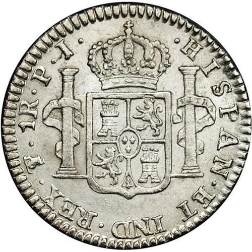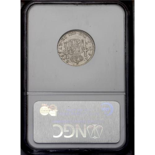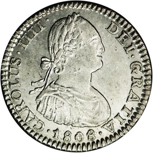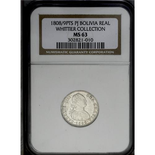 <B>Carlos IIII Real 1808-PJ Overdate 8/9, </B></I>KM70, MS63 NGC, full white mint luster with just a hint of toning on the reverse. The final 8 in the date appears to be punched over a 9 (or possibly a 0.) Very scarce and recognized variety.