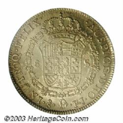 <TABLE cellSpacing=0 cellPadding=0 width="100%" bgColor=#000000 border=0><TBODY> <TR><TD width="100%"><TABLE cellSpacing=1 cellPadding=3 width="100%" border=0><TBODY><TR><TD width="100%" bgColor=#79735c><FONT face=arial color=#ffffff size=3><B>Description</B> </FONT></TD></TR><TR><TD width="100%" bgColor=#ffffff><FONT face=arial size=2><B>Carlos IIII gold 8 Escudos 1803-So FJ,</B></I> KM54, XF45 ICG. </FONT></TD></TR></TBODY></TABLE></TD></TR></TBODY></TABLE><BR><A name=PricesRealized></A><TABLE cellSpacing=0 cellPadding=0 width="100%" bgColor=#000000 border=0><TBODY><TR><TD width="100%"><TABLE cellSpacing=1 cellPadding=3 width="100%" border=0><TBODY><TR><TD width="100%" bgColor=#79735c><A name=PR><FONT face=arial color=#ffffff size=3><B>Previous Prices from Heritage Auctions</B> </FONT></A></TD></TR><TR><TD bgColor=#f6f6ed>No Prior Data Recorded </TD></TR><TR><TD bgColor=#ffffff><FONT face=arial size=1 ?>PLEASE NOTE: All prices realized reflect the final hammer price PLUS the buyer's premium in auctions that charge a buyer's premium. Each item has a notation at the top of the listing indicating whether that lot included a buyer's premium. Example: A item that sells with a final hammer price of $100 and a 20% buyer's premium will display with a price realized of $120. All information listed is intended to be as accurate as possible, but errors are possible. Please use this guide carefully and inform us of any inaccuracies. </FONT></TD></TR></TBODY></TABLE></TD></TR></TBODY></TABLE><BR><TABLE cellSpacing=0 cellPadding=0 width="100%" bgColor=#000000 border=0><TBODY><TR><TD width="100%"><TABLE cellSpacing=1 cellPadding=3 width="100%" border=0><TBODY><TR><TD width="100%" bgColor=#79735c colSpan=6><FONT face=arial color=#ffffff size=3><B>Price Guide*</B> </FONT></TD></TR><TR bgColor=#f6f6ed><TD align=middle><B>Grade</B> </TD><TD align=middle><B>Coin World<BR>(Trends)</B> </TD><TD align=middle><B>Numismedia<BR>Retail</B> </TD><TD align=middle><B>Numismedia<BR>Wholesale</B> </TD><TD align=middle><B>Coin<BR>Universe</B> </TD><TD align=middle><B>Heritage<BR>Value Index</B> </TD></TR><TR bgColor=#ffffff><TD colSpan=6><FONT size=1>*All information listed is intended to be as accurate as possible, but errors are possible. No item may be returned or refused based on this information which is provided as a service to our customers. You should contact each pricing source directly to determine the accuracy of this information. </FONT></TD></TR></TBODY></TABLE></TD></TR></TBODY></TABLE><BR><TABLE cellSpacing=0 cellPadding=0 width="100%" bgColor=#000000 border=0><TBODY><TR><TD width="100%"><TABLE cellSpacing=1 cellPadding=3 width="100%" border=0><TBODY><TR><TD width="100%" bgColor=#79735c><FONT face=arial color=#ffffff size=3><B>Population Guide</B> </FONT></TD></TR><TR bgColor=#ffffff> Important notice: Heritage usually auctions material at the rate of 200-250 lots per hour. On some occasions eBay Live bid software or the Internet may not be able to keep up with the pace of the auction. We recommend placing a realistic absentee bid now as insurance to avoid disappointment. Occasionally the auctioneer may eliminate or reject an eBay Live bid, and the auctioneer may also reopen a lot after the close of the eBay live bidding (usually because we missed an audience bid), and may reject your bid even if it shows you as the winning bidder. By bidding via eBay Live, you agree that Heritage may award the lot to another bidder at its sole discretion under the circumstances described above or any other reasonable circumstances. Also please note that all Heritage lots purchased through eBay Live carry a 20% Buyer's Premium. Please make sure you read the Terms and Conditions before you bid.</TD></TR></TBODY></TABLE></TD></TR></TBODY></TABLE>