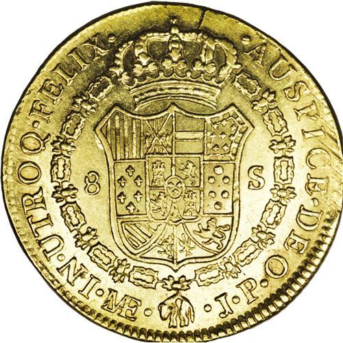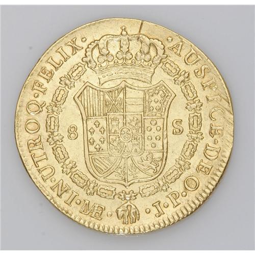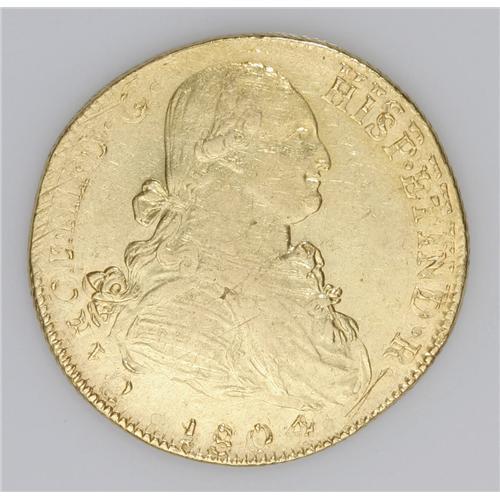 <B>Carlos IIII gold 8 Escudos 1804-JP, </B></I>KM101, AU with a particularly choice reverse, the obverse is double-struck with the second strike slightly off-center leaving the portions beginning with HISP notably doubled. An interesting mint error!