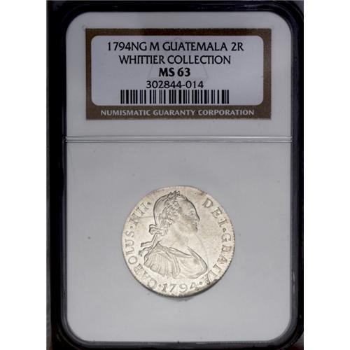 <B>Carlos IV 2 Reales 1794NG-M, </B></I>KM51, MS63 NGC, a superb coin with meticulously bold details, no adjustment marks, and flashy prooflike mint luster. Rare and highly desirable in this quality.