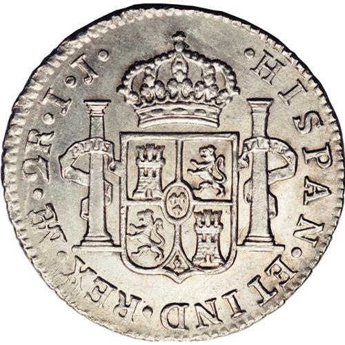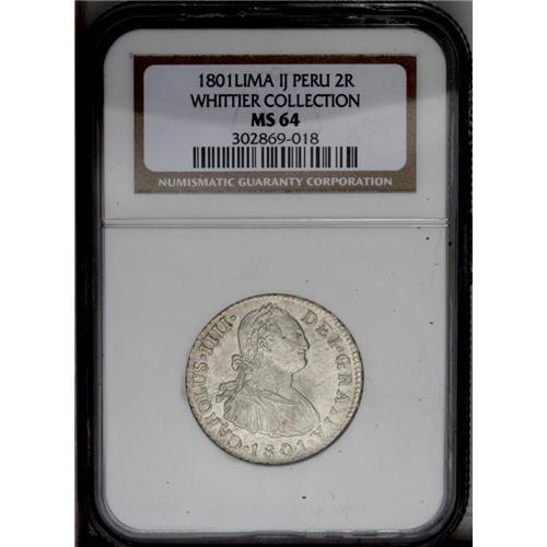 <B>Carlos IV 2 Reales 1801-IJ, </B></I>KM95, MS64 NGC, a remarkably bold example with full mint brilliance, rare grade for this type.
