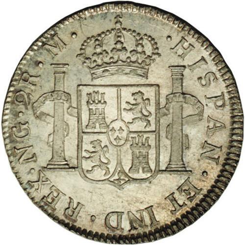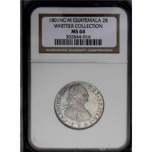 <B>Carlos IV 2 Reales 1801NG-M, </B></I>KM51, MS64 NGC, a virtually perfect coin with subtle lilac-gray patina, full mint luster and razor sharp details. Rare and exceptionally appealing quality for the colonial series.