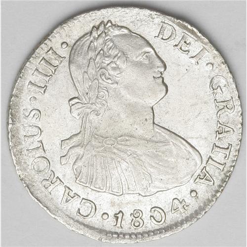 <B>Carlos IV 2 Reales 1804-JP, </B></I>KM95, lustrous AU-UNC, nicely detailed, very scarce grade.