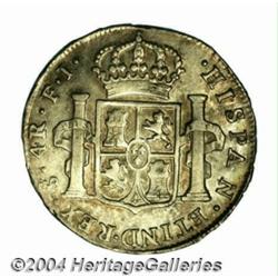 Carlos IV 4 Reales 1807-FJ, KM60, AU with beautiful gold and gray toning and exceptional surfaces. Although this coin exhibits some light wear on the high points, it has the overall eye appeal of a mint state example.From the Morris Geiger Collection. Important notice: Heritage usually auctions material at the rate of 200-250 lots per hour. On some occasions eBay Live bid software or the Internet may not be able to keep up with the pace of the auction. We recommend placing a realistic absentee bid now as insurance to avoid disappointment. Occasionally the auctioneer may eliminate or reject an eBay Live bid, and the auctioneer may also reopen a lot after the close of the eBay live bidding (usually because we missed an audience bid), and may reject your bid even if it shows you as the winning bidder. By bidding via eBay Live, you agree that Heritage may award the lot to another bidder at its sole discretion under the circumstances described above or any other reasonable circumstances. Also please note that all Heritage lots purchased through eBay Live carry a 20% Buyer's Premium. Please make sure you read the Terms and Conditions before you bid.