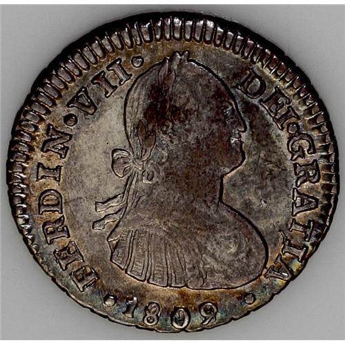 <B>Carlos IV & Ferdinand VII Trio, </B></I>KM58 Real 1807FJ-So, toned VF-XF, very attractive, KM65 Real 1809/8, choice toned VF-XF, variety with FERDIN VII clearly punched over CAROLUS IIII, listed in the SCWC but unpriced, and KM66 2 Reales 1808FJ-So, Ferdinand VII with bust of Carlos IV, toned VG with all details clear, very rare date.