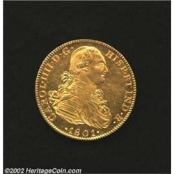 Carlos IV Gold 8 Escudos 1801-FM, KM159, Superb AU-UNC with prooflike mint lustre. Really a fantasti
