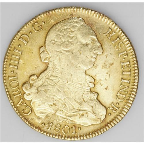 Carlos IV gold 8 Escudos 1801-AJ, KM54, VF-XF with plan Carlos IV gold 8 Escudos 1801-AJ,