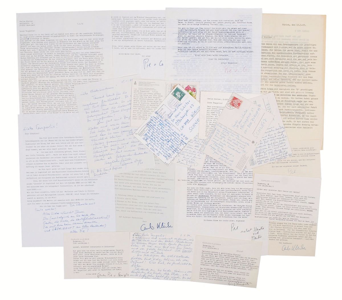 Austrian conductor (1930–2004) considered one of the greatest of the 20th century. Collection of eighteen letters in German consisting of five ALSs and thirteen TLSs, totaling 21 pages on sheets and postcards of various sizes, dated from 1964 to 1996. Untranslated correspondence from Kleiber to Dr. Hans Schutze in Zurich, signed in several different manners, including “Carlos,” “Pie,” and “Pie & Co.” In overall fine condition. Accompanied by various other letters and ephemera.