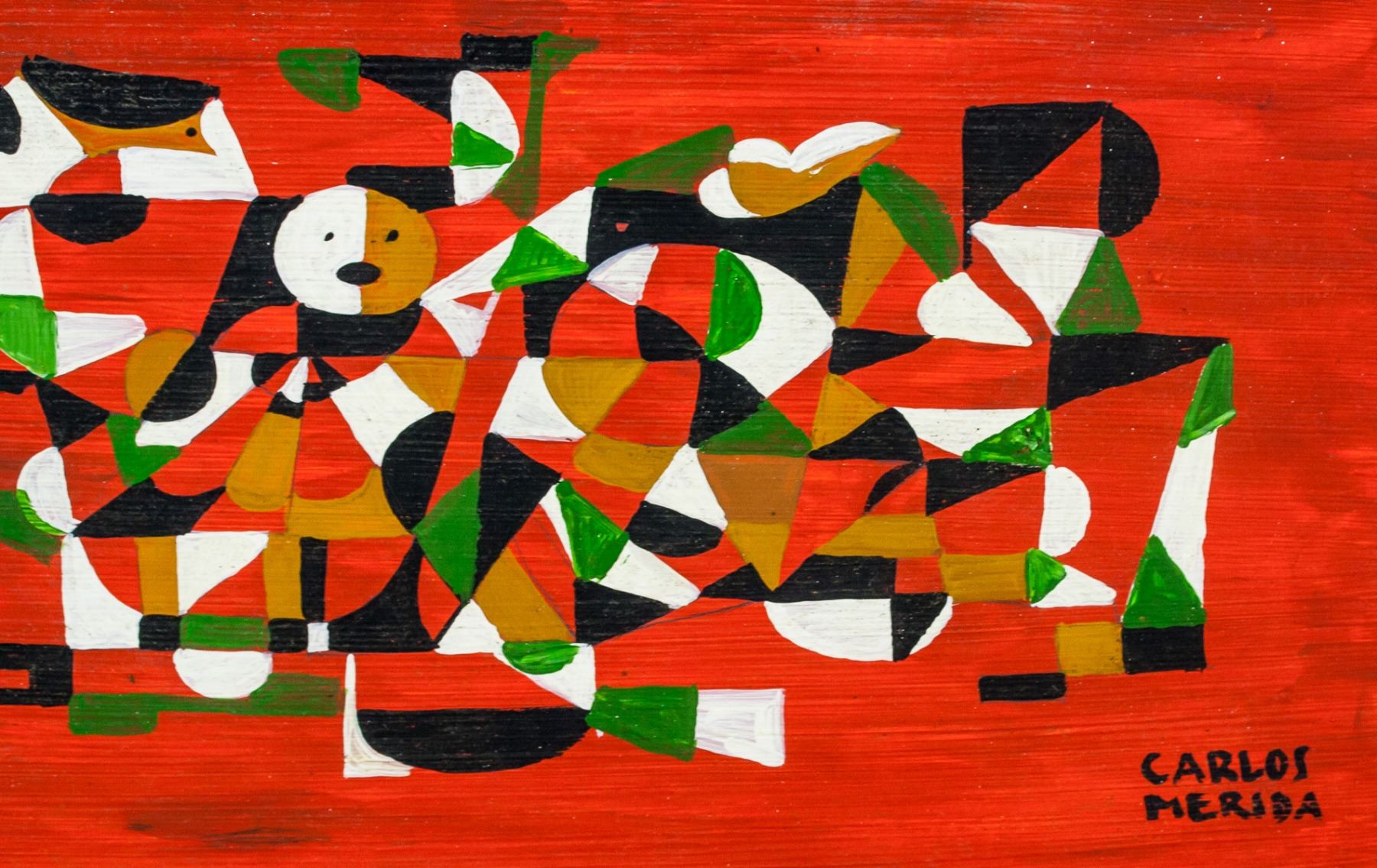 Gouache on canvas, stretched and framed. Featuring an abstract expressionist composition. Signed CARLOS MERIDA on the lower right corner. Attributed to Carlos Merida (1895-1984, Guatemalan). 16.5 x 30.5 cm (6.5 x 12.0 inches). PROVENANCE: Southern Ontario estate