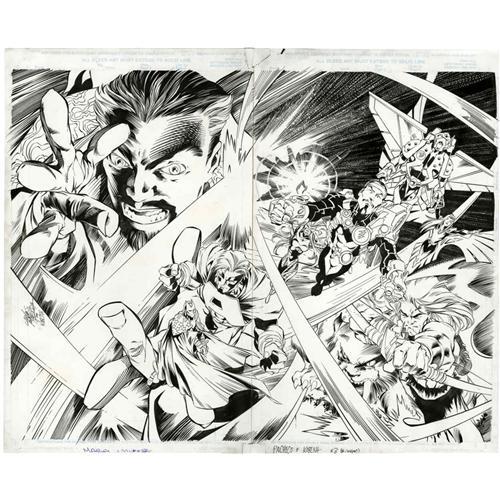 <B>Carlos Pacheco and Scott Koblish - Tales of the Marvel Universe #1 Cover Original Art (Marvel, 1997).</B></I> The dawn of a new age of heroes begins with this stupendous wrap-around cover illustration by penciler Carlos Pacheco (<B>Avengers Forever</B></I>, <B>X-Men</B></I>, and <B>Green Lantern</B></I>), and Eisner Award nominated inker Scott Koblish. Doctor Strange, Ka-Zar, Zabu, and the Thunderbolts fill this unforgettable 20" x 15.5" image area. In Excellent condition.