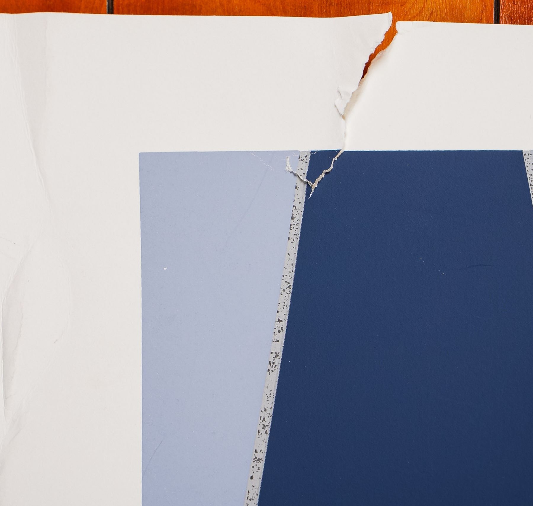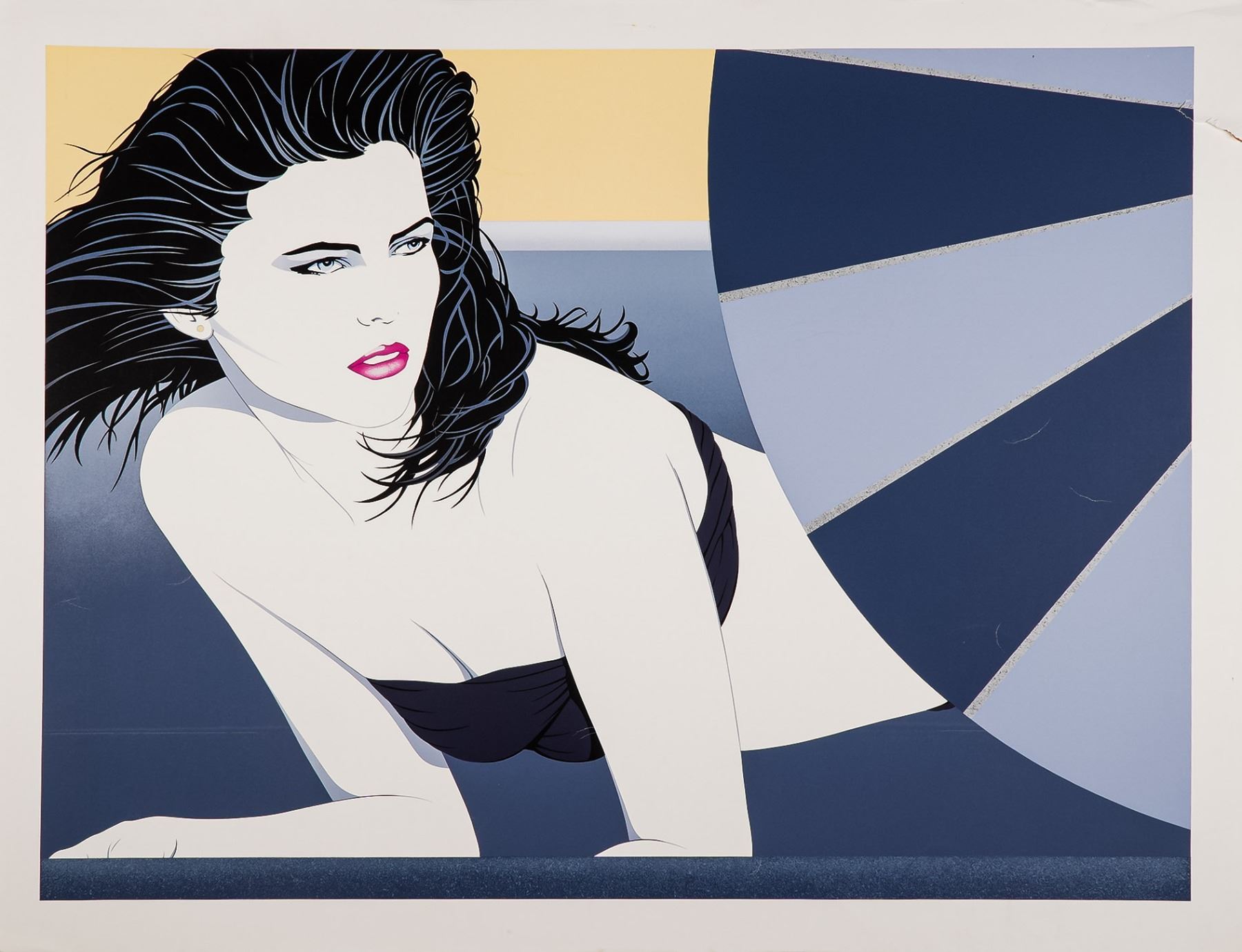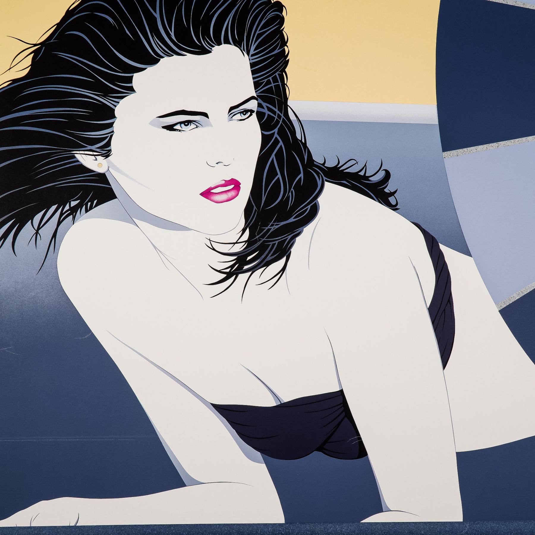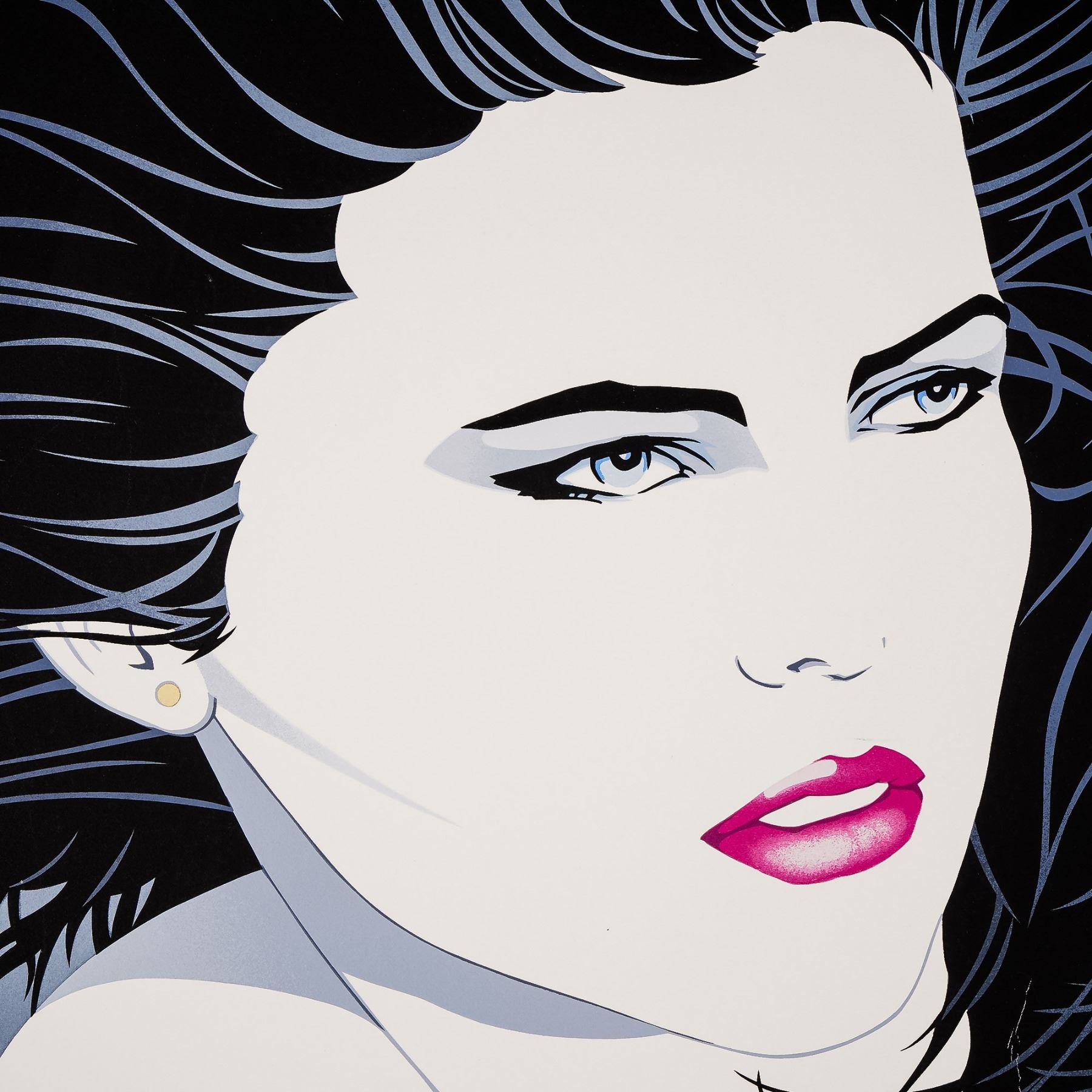 Striking large-scale serigraph on paper by Colombian artist Carlos Sanchez, reminiscent of the bold and glamorous style of Patrick Nagel. The work depicts a confident woman in a black strapless top, her flowing dark hair set against an angular Art Deco backdrop. The sharp contrasts of black, white, and cobalt blue are accented with vivid pink lips and piercing blue eyes, creating a captivating and dramatic composition. Sanchez's mastery of stylized portraiture reflects the sleek, fashion-inspired aesthetic of the 1980s. A vibrant and commanding example of modern Art Deco revival that would make a dynamic statement piece in any collection.