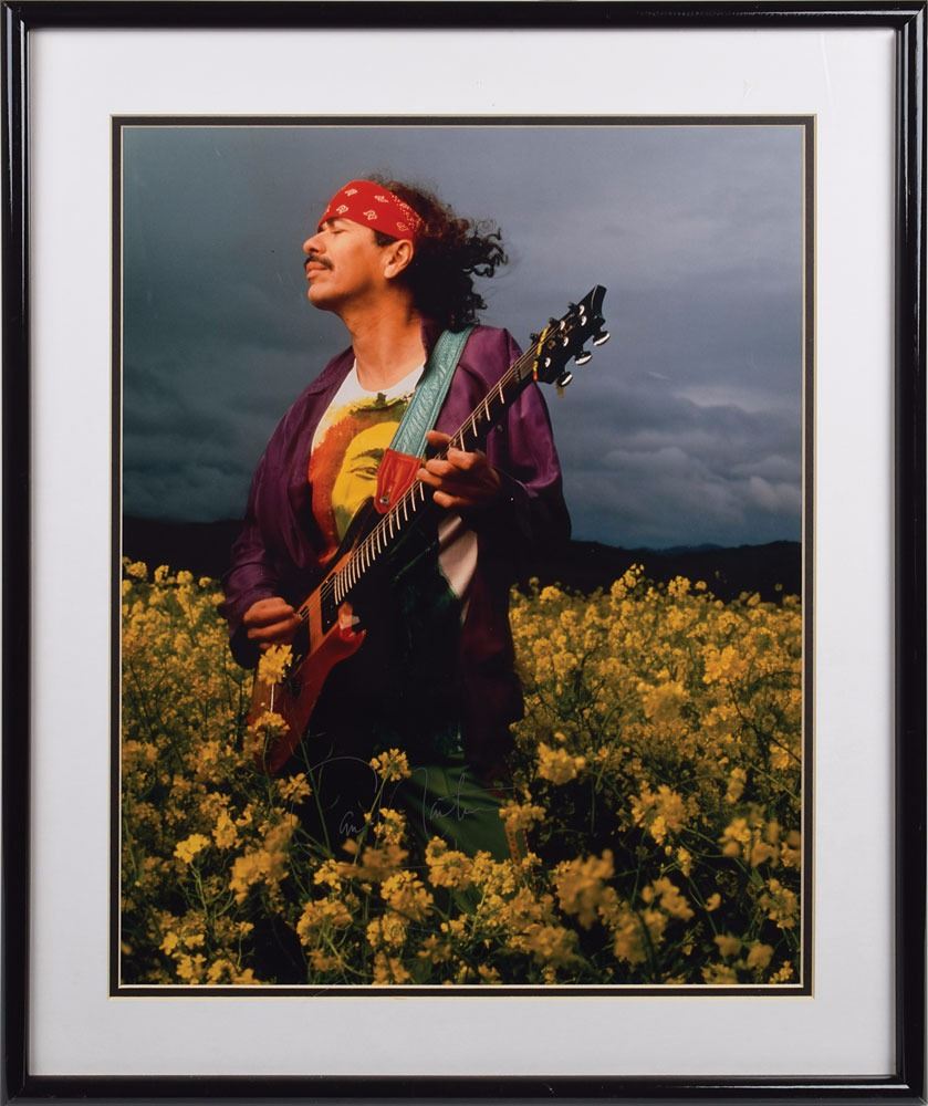 Limited edition color semi-glossy 15.5 x 19.5 photo of Santana playing his guitar in a field of flowers, numbered 55/190, nicely signed in silver ink. Double-matted and framed to a slightly larger size. In fine condition.