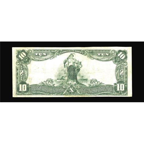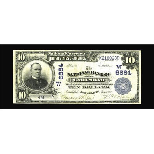 <B>Carlsbad, NM</B></I> - $10 1902 Plain Back Fr. 628 <B>The NB of Carlsbad</B></I> Ch. # (W)6884<BR>A wonderful note from a bank with only two notes known, one a Territorial from the Irish holdings which sold in 1997 and has been unavailable since, and this state issue example. This bank was missing from both the Burnworth and Latimer collections, with the latter offering lacking even one large Carlsbad specimen. When this note made its only appearance ever at public sale in our January, 2004 FUN sale, we noted "Any estimate on National Bank Note rarities these days is just a guess, but this attractive pen signed <B>Fine-Very Fine</B></I> example will certainly reach and very likely exceed our conservative estimate of $6000-9000." At that time, the note brought $16,100 after a bruising floor battle. Again, any estimate here is just a guess, but if rarity, desirability and past performance are any guide, expect to see a winning bid in the area of...