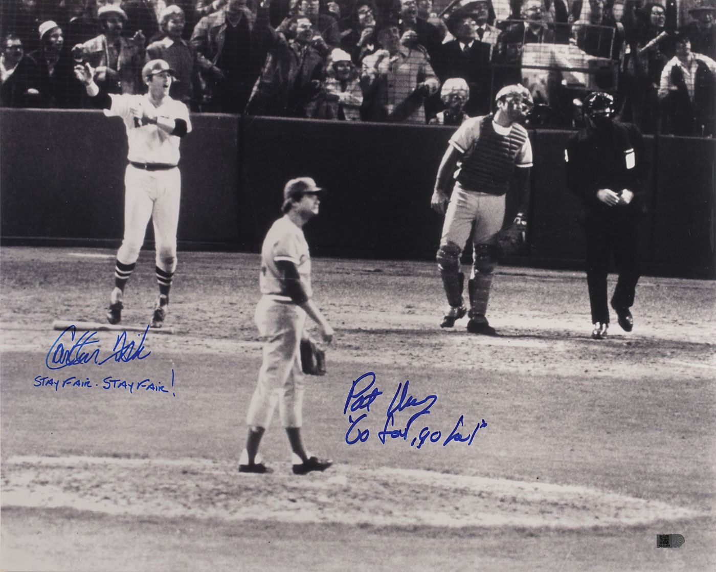 Glossy 20 x 16 photo of Boston's Cartlon Fisk waving his home-run fair during the 12th inning of Game 6 of the 1975 World Series, signed in blue felt tip, "Carlton Fisk, Stay Fair, Stay Fair!" and "Pat Darcy, 'Go foul, go foul.'" In very fine condition, with an authenticity label affixed to lower right corner.