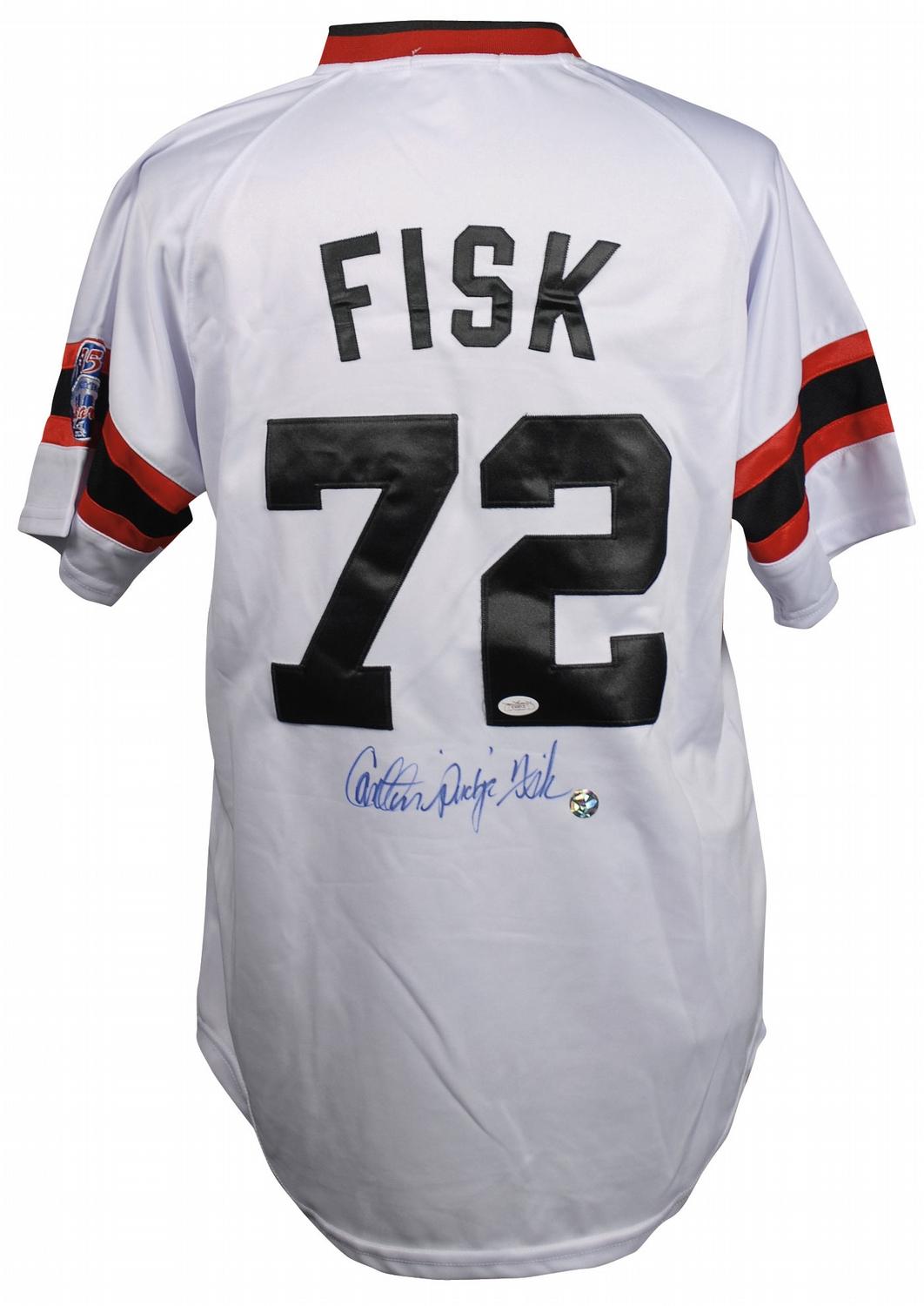 Official Mitchell & Ness Cooperstown Collection replica Chicago White Sox baseball jersey, with sewn on letters and numbers, signed in blue felt tip on the back, “Carlton ‘Pudge’ Fisk.” In very fine condition with a James Spence authentication sticker affixed and accompanied by a certificate of authenticity from James Spence.