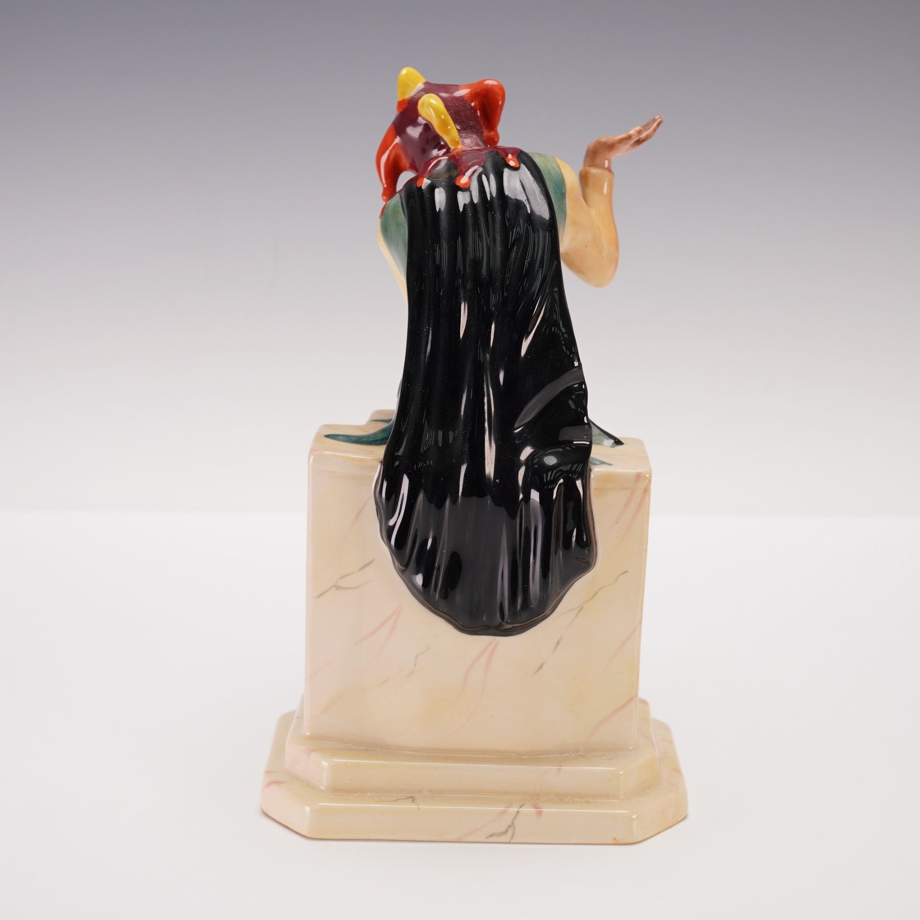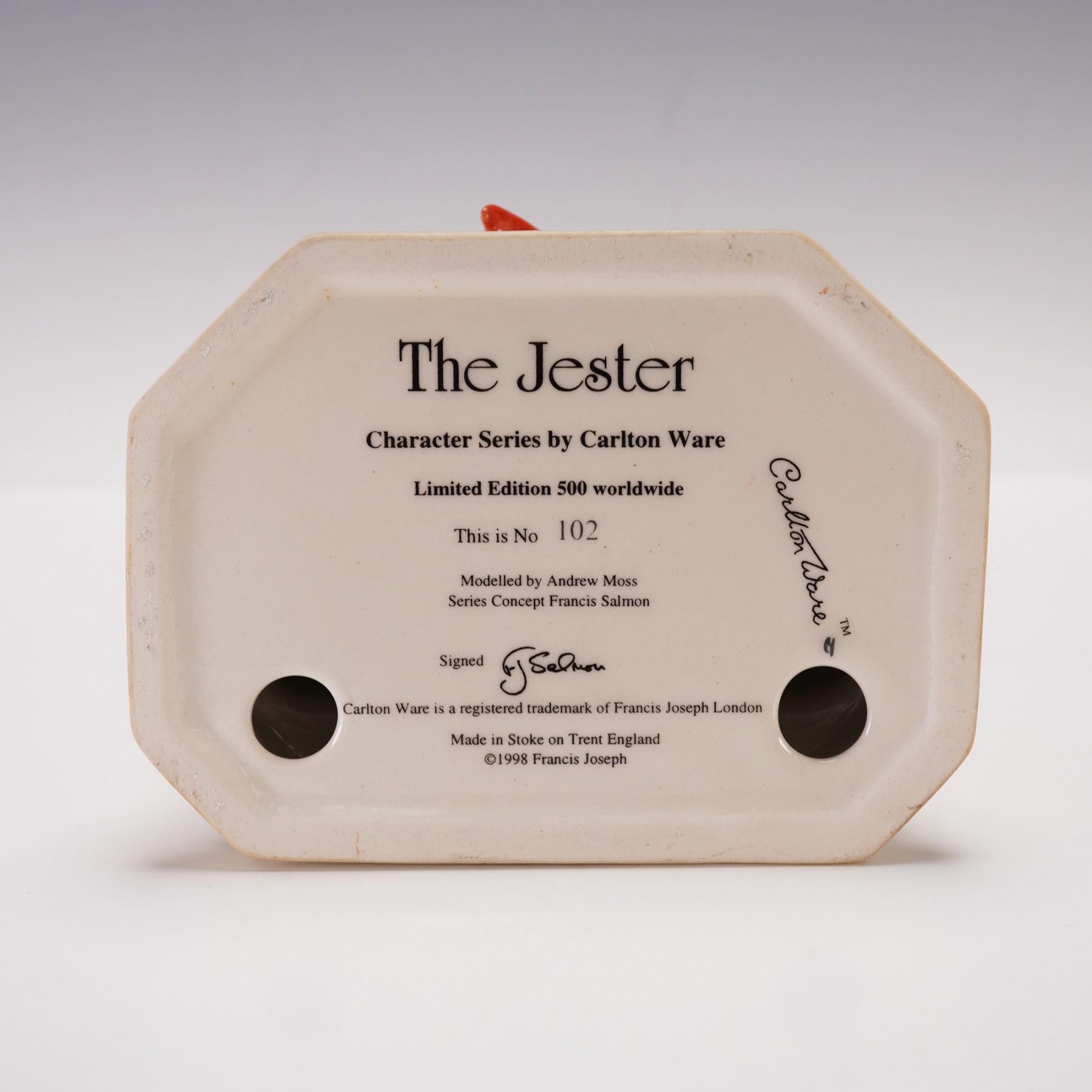 Features a seated jester wearing a multicolored outfit in yellow, green, red, and maroon tones, with a black cape draped over his back. The base is finished to resemble marble. Designed and modeled by Andrew Moss with the series concept by Francis Salmon, and signed by F. J. Salmon. The underside is marked Carlton Ware.