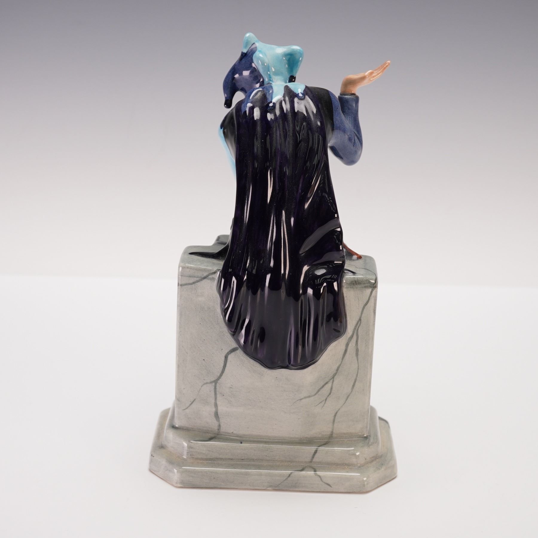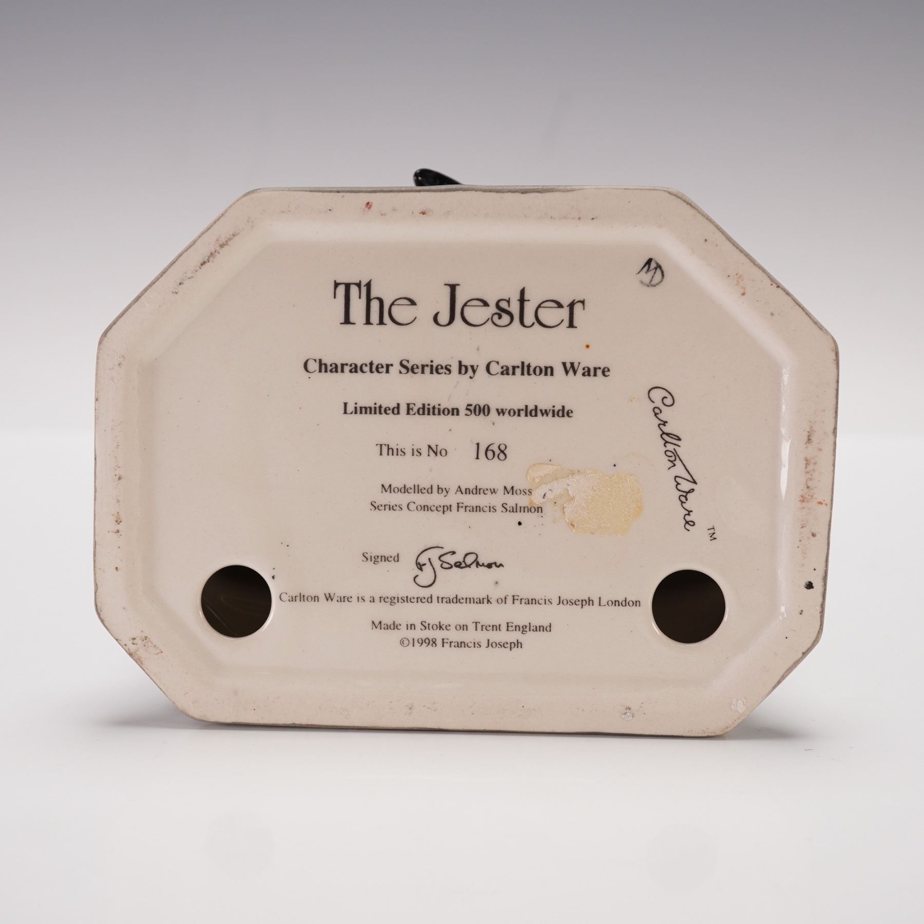 Limited edition porcelain figurine numbered 168 of 500 worldwide. Designed by Andrew Moss with series concept by Francis Salmon, and signed by Francis Joseph Salmon. The piece depicts a seated jester resting on a marble-effect plinth, finished in shades of blue and black glaze. Base marked with edition details, artist signatures, and Carlton Ware backstamp.