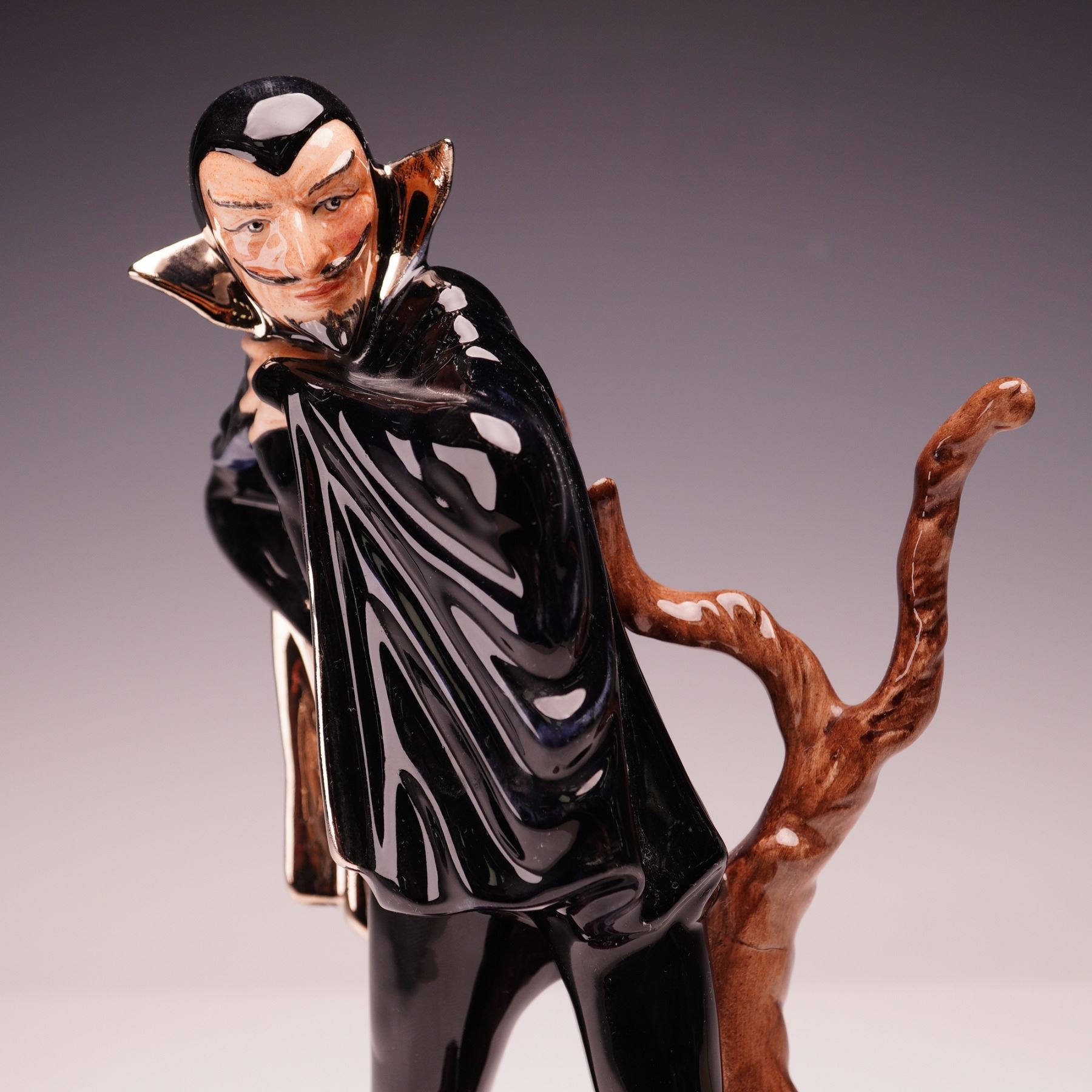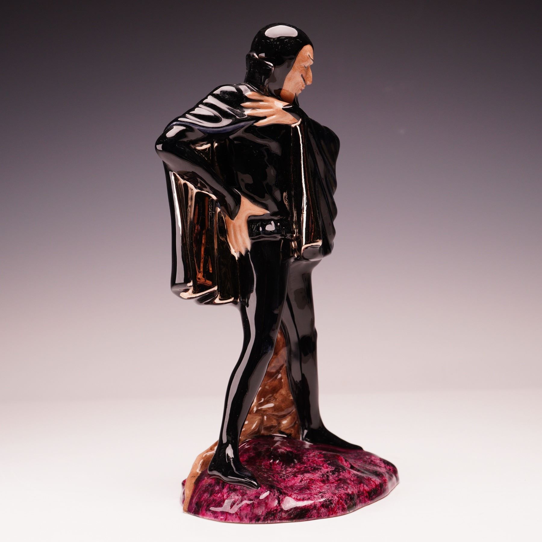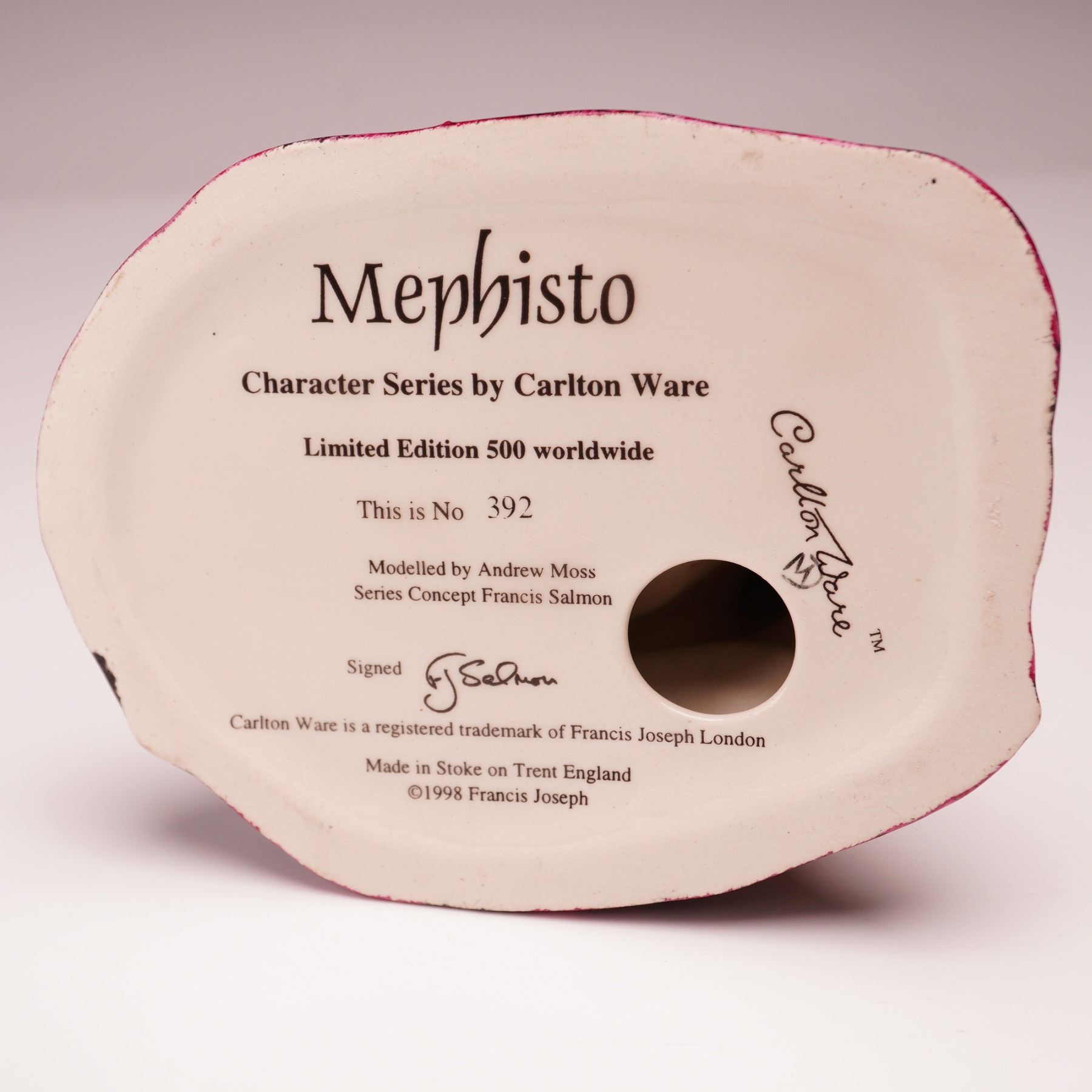 Issued as part of the Character Series by Carlton Ware, this porcelain figurine titled Mephisto shows the character in a black outfit with a black cloak lined in a metallic silver-tone, standing beside a twisted tree trunk. Produced in a limited edition of 500 worldwide, this example is numbered 392. Designed in 1998, modeled by Andrew Moss with series concept by Francis Salmon. Signed to the base and marked with the Carlton Ware backstamp. Made in Stoke-on-Trent, England.