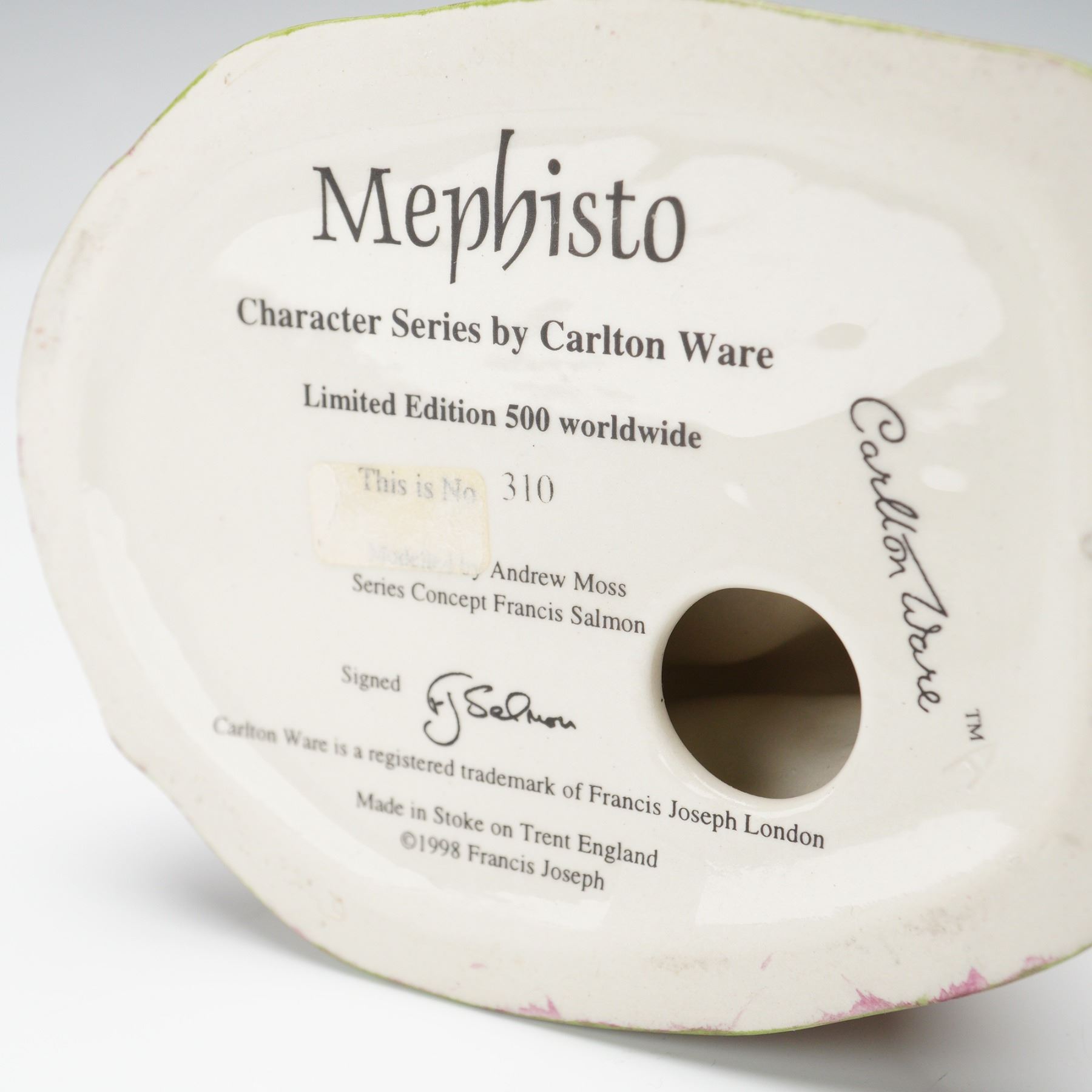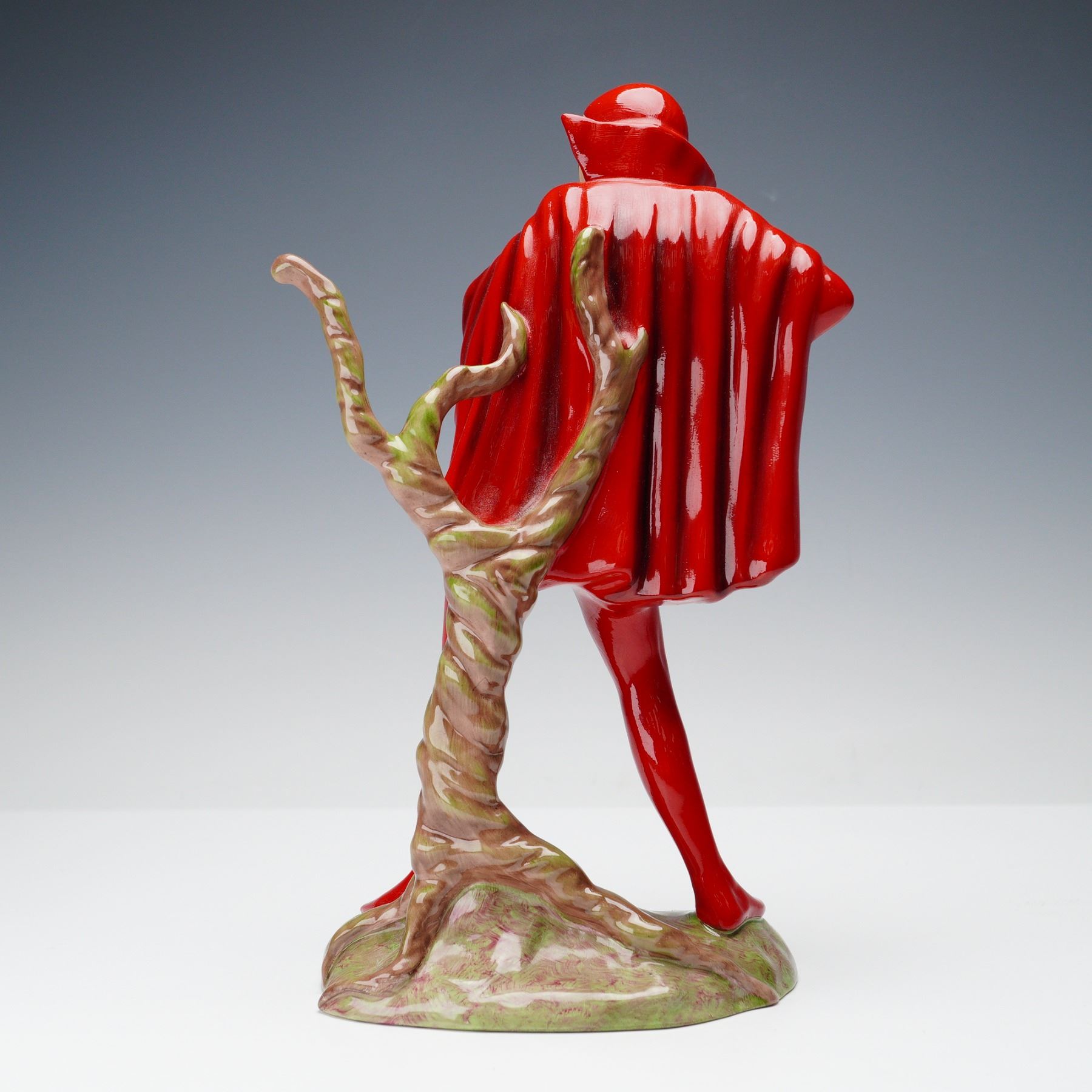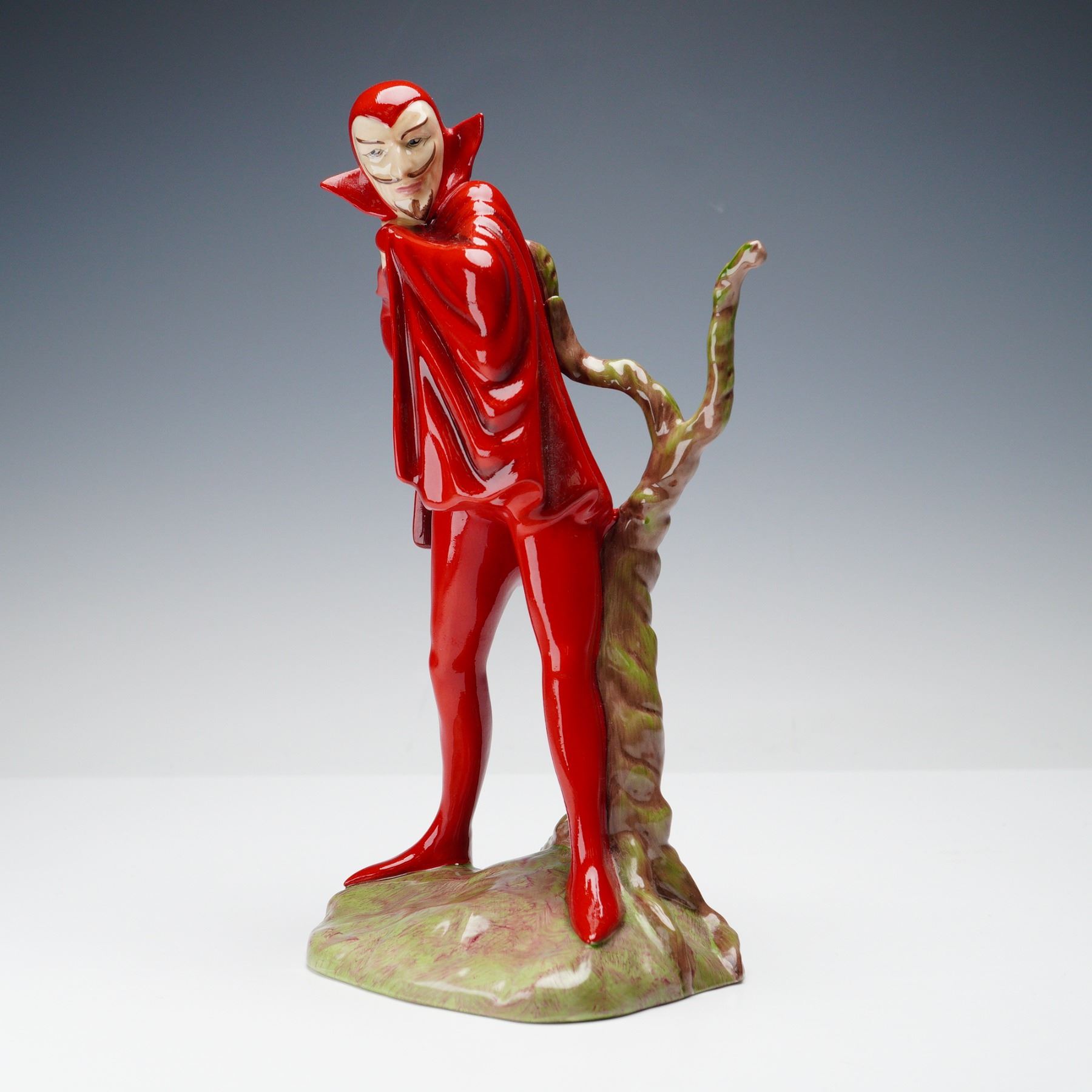 Issued as part of the Character Series by Carlton Ware, this figurine titled Mephisto shows the character in a striking red outfit with a matching cloak, standing beside a twisted tree trunk. Produced in a limited edition of 500 worldwide, this example is numbered 310. Designed in 1998, modeled by Andrew Moss with series concept by Francis Salmon. Signed to the base and marked with the Carlton Ware backstamp. Made in Stoke-on-Trent, England.