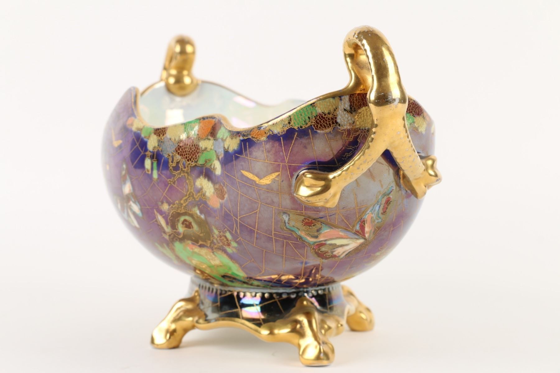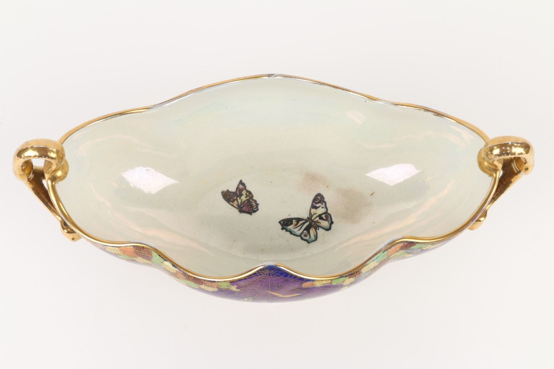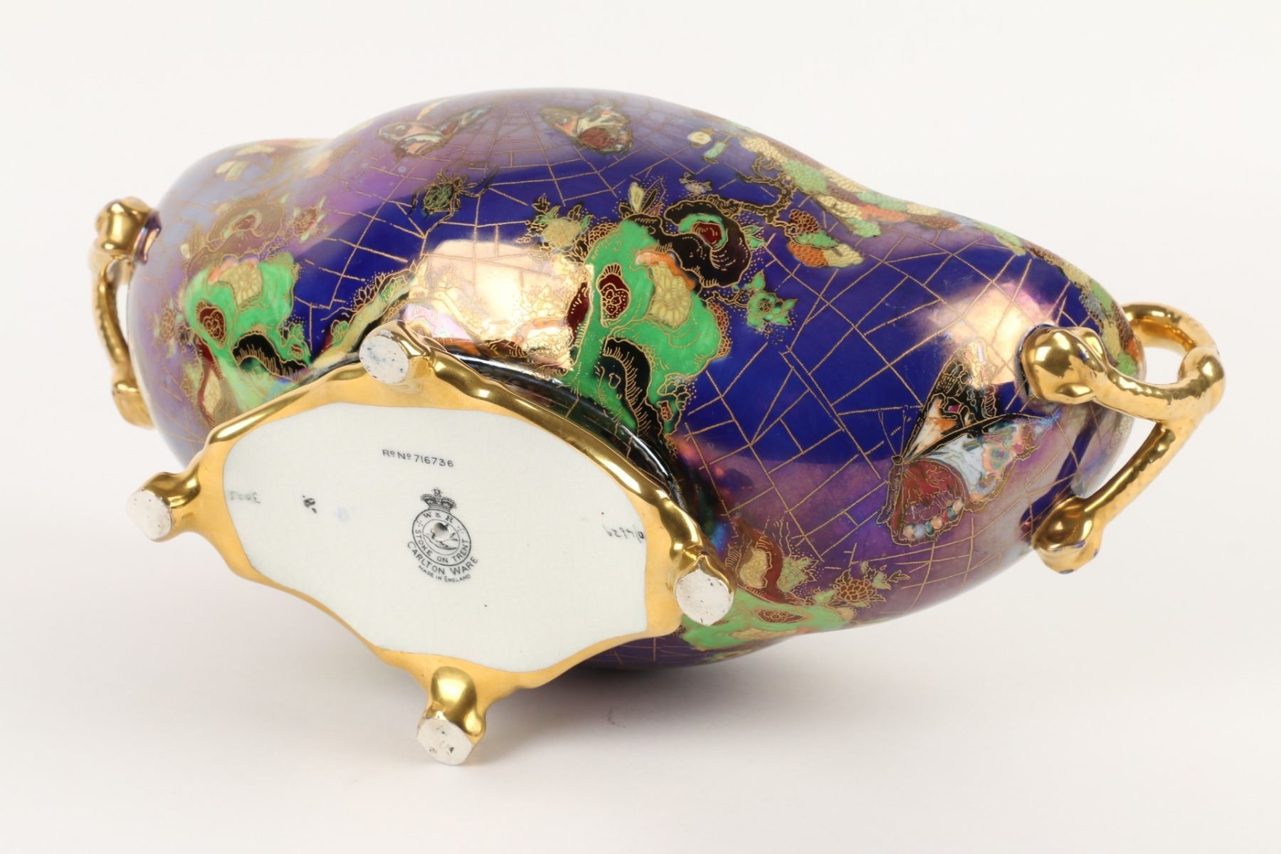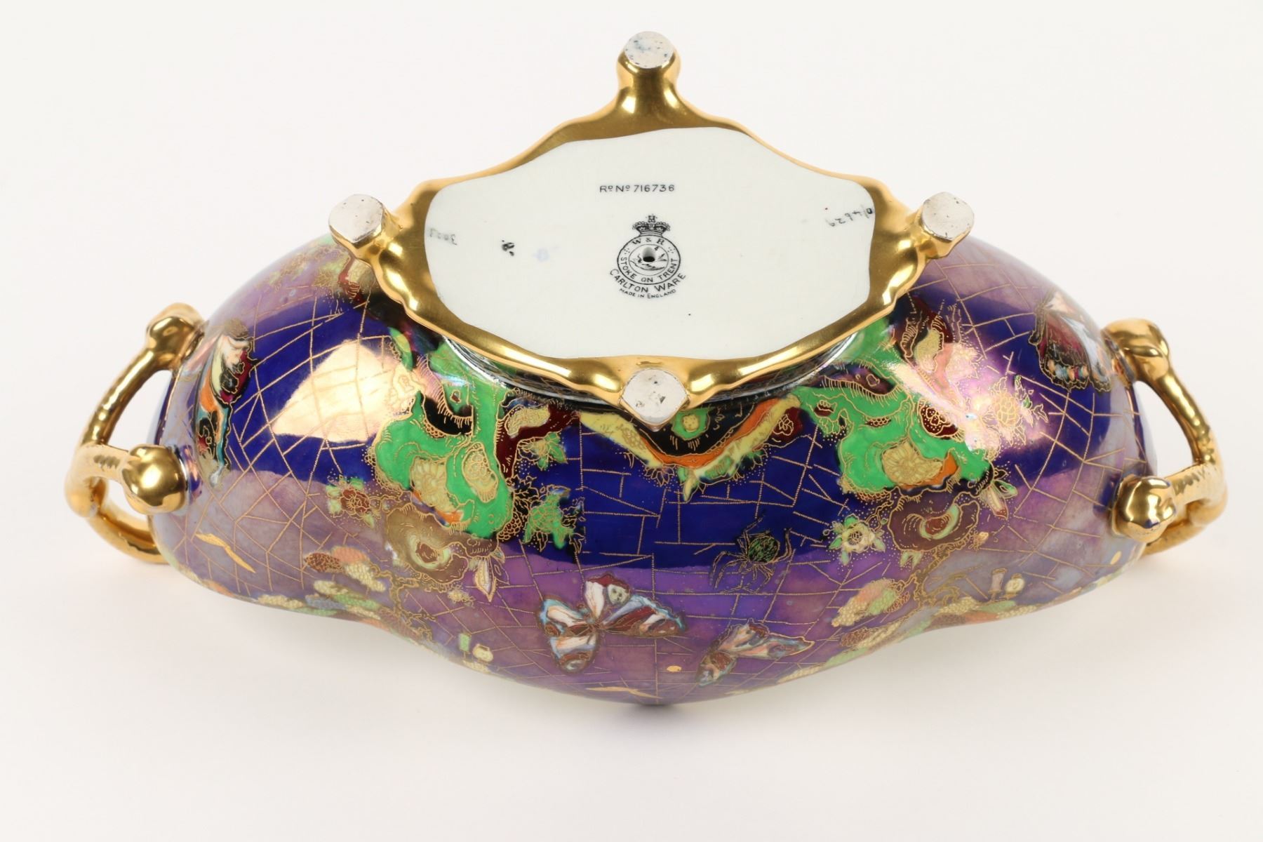 Lot 215 - English. Heavily decorated with enamel and gold. Butterflies in the bottom. Marked, "Carlton Ware - Made in England - Rd No. 716736" - W & R". 6.5” x 13” x 6”. $200-300.