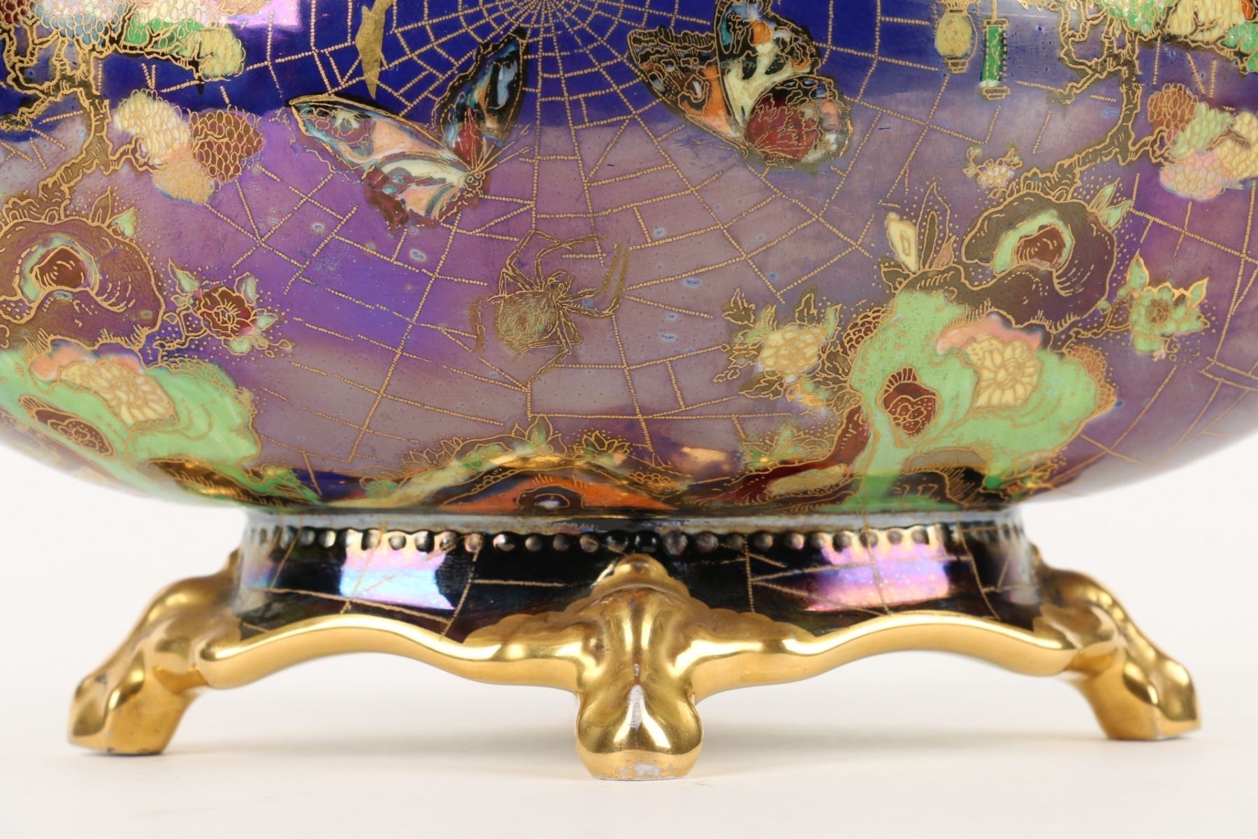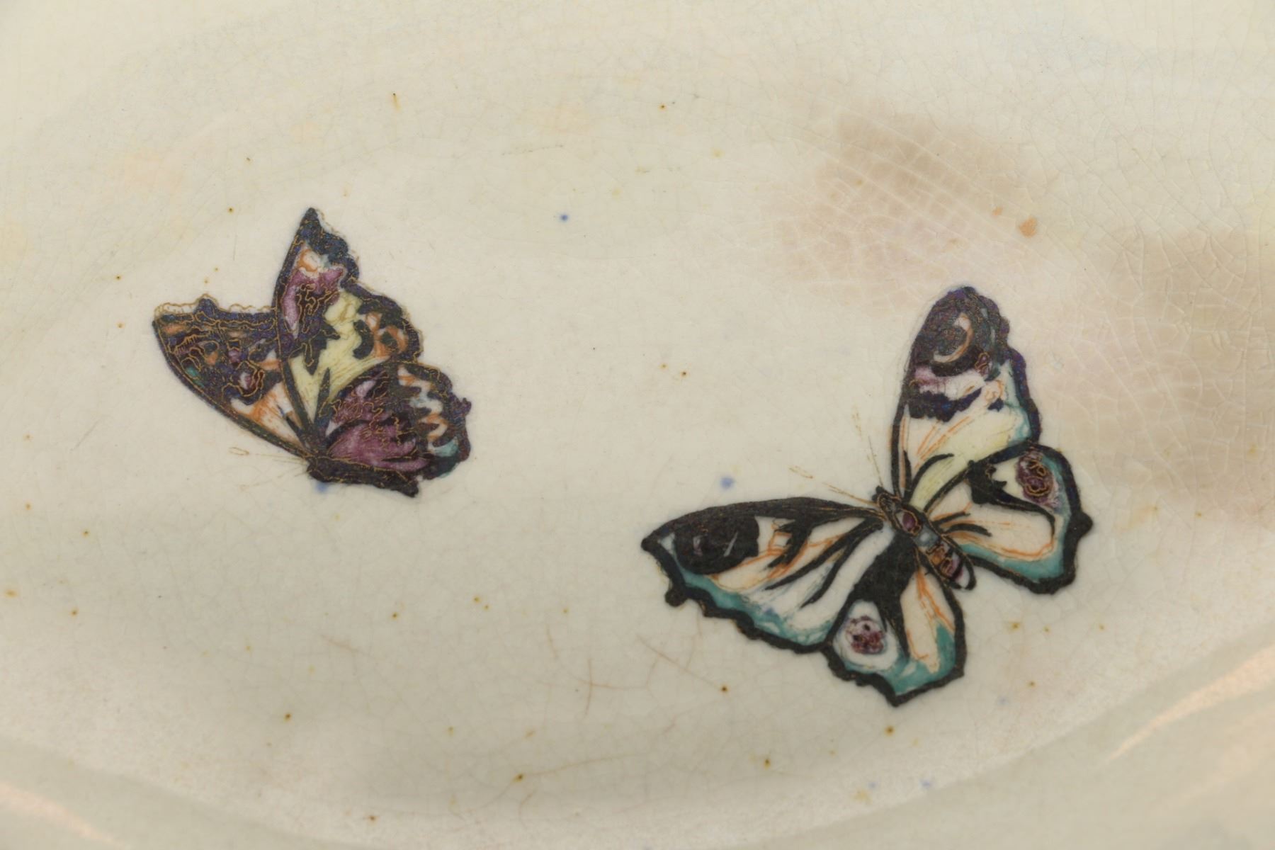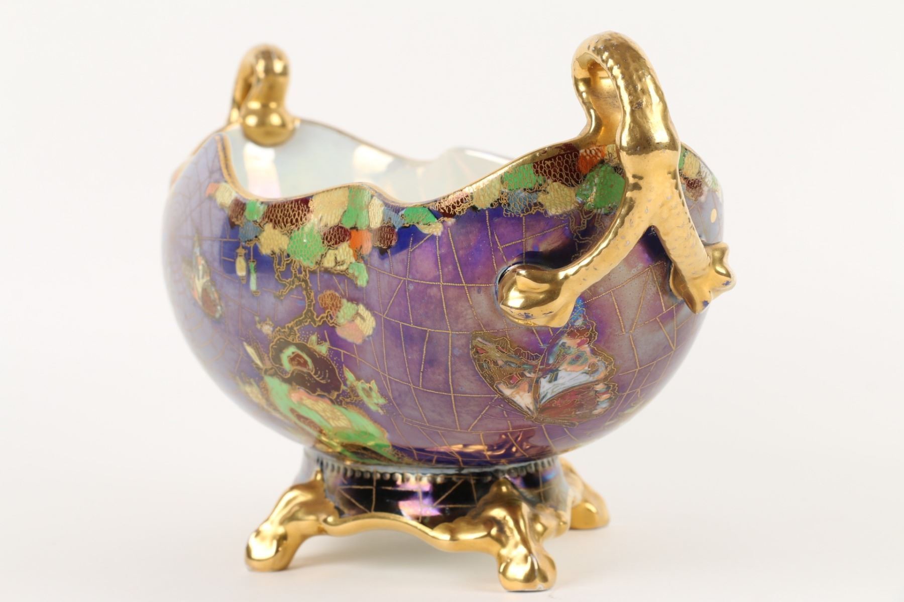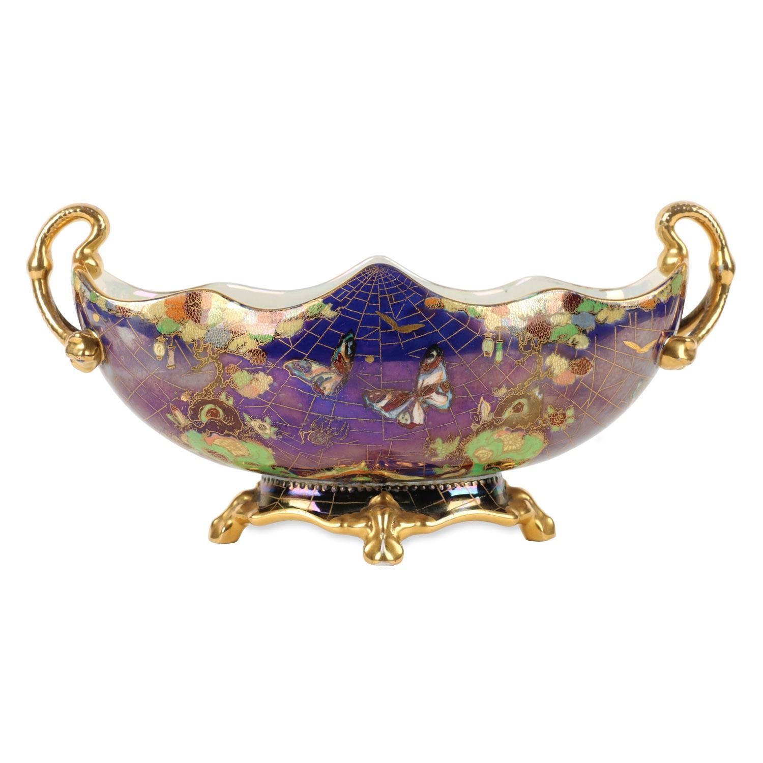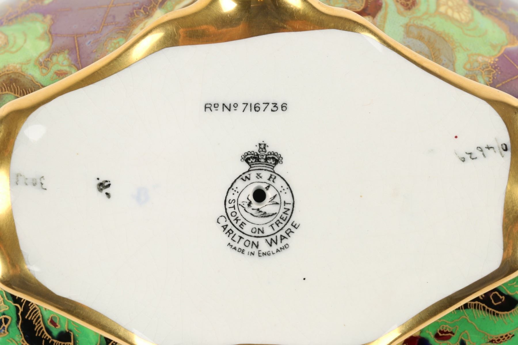 Lot 215 - English. Heavily decorated with enamel and gold. Butterflies in the bottom. Marked, "Carlton Ware - Made in England - Rd No. 716736" - W & R". 6.5” x 13” x 6”. $200-300.