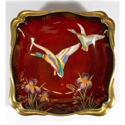 Carltonware Rouge Royale square dish, hand painted and gilded with mallards above flowers, printed marks and paper label to back, 19cm long
