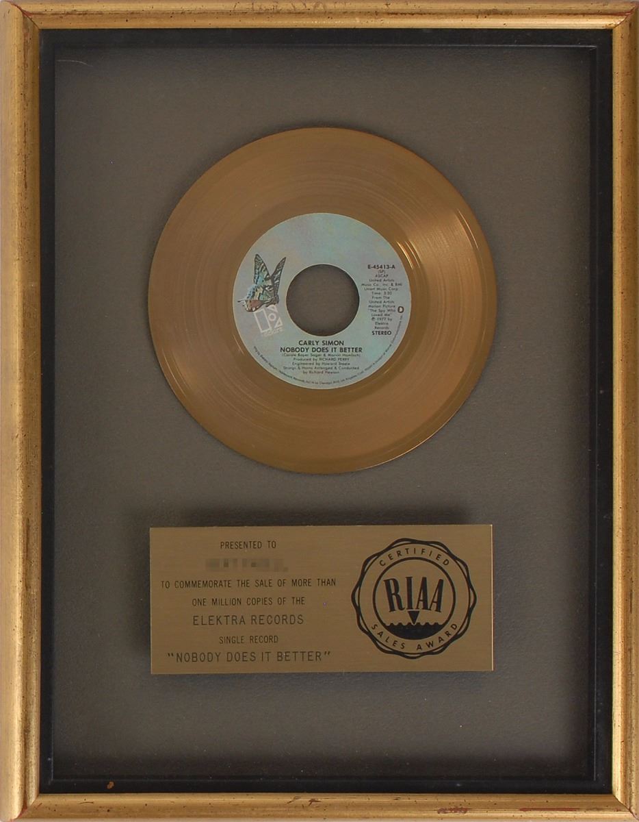 Official floater-style RIAA gold sales award presented “to commemorate the sale of more than one million copies of the Elektra Records single record ‘Nobody Does It Better.’” Framed with its disc and plate to an overall size of 13 x 17. Award retains its original backing. In fine condition.