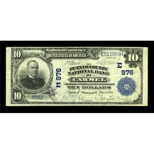 <B>Carmel, NY</B></I> - $10 1902 Plain Back Fr. 624 <B>The Putnam County NB</B></I> Ch. # (E)976<BR> An attractive Blue Seal from this much sought after bank which has been off the market since we sold it to our consignor in February of 1981. Sharp <B>Very Fine-Extremely Fine,</B></I> with the signatures of long time owners S. Ryder and Clayton Ryder. <BR><I>From The Thomas A. Bergin Collection</B></I><BR><BR><b>Shipping:</b> Coins & Currency (<a target="_blank" href="http://www.heritageauctions.com/common/shipping.php">view shipping information</a>)