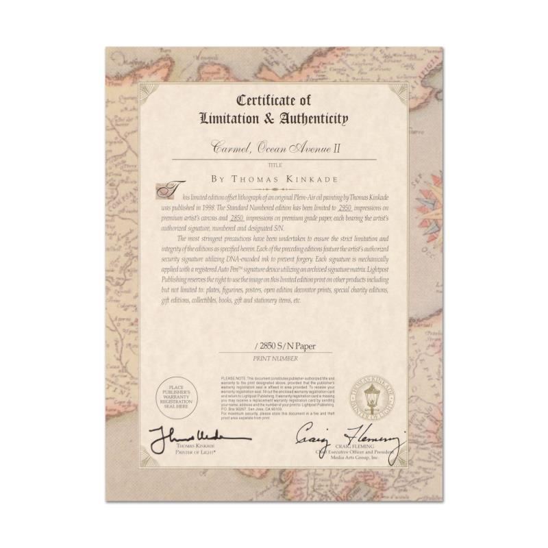 "Carmel, Ocean Ave II" is an offset lithograph on paper by Thomas Kinkade (1958-2012), numbered and hand signed by the artist. Includes Certificate of Authenticity from Lighthouse Publishing. Measures approx. 14" x 12" (border), 10" x 8" (image).